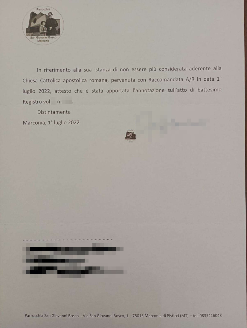 Una persona ha chiesto la rettifica dei dati relativi al proprio battesimo avvenuto a S. Giovanni Bosco - PISTICCI (MT) il 01/07/2022, dichiarando di non voler più far parte della Chiesa Cattolica.
