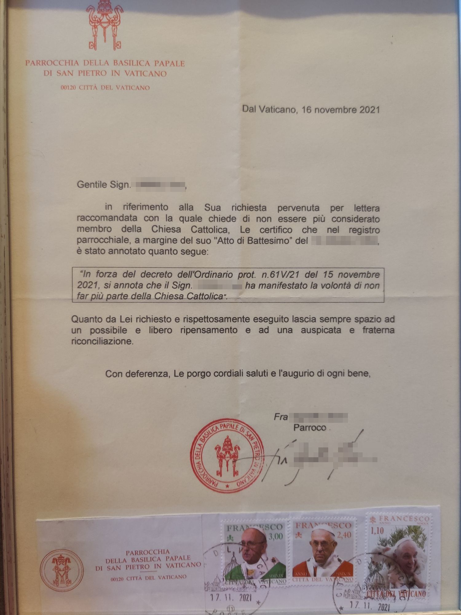 Una persona ha chiesto la rettifica dei dati relativi al proprio battesimo avvenuto a San Pietro in Vaticano - CITTÀ DEL VATICANO il 16/11/2021, dichiarando di non voler più far parte della Chiesa Cattolica.