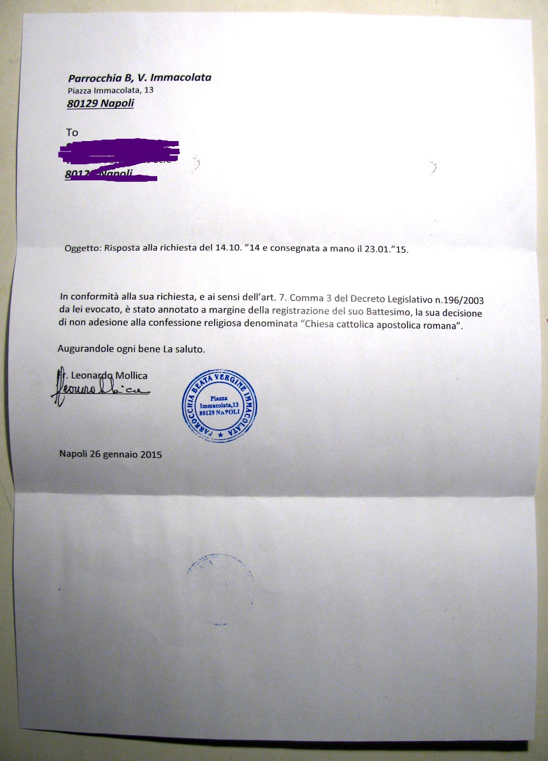 Una persona ha chiesto la rettifica dei dati relativi al proprio battesimo avvenuto a Beata Vergine Immacolata - NAPOLI (NA) il 26/01/2015, dichiarando di non voler più far parte della Chiesa Cattolica.