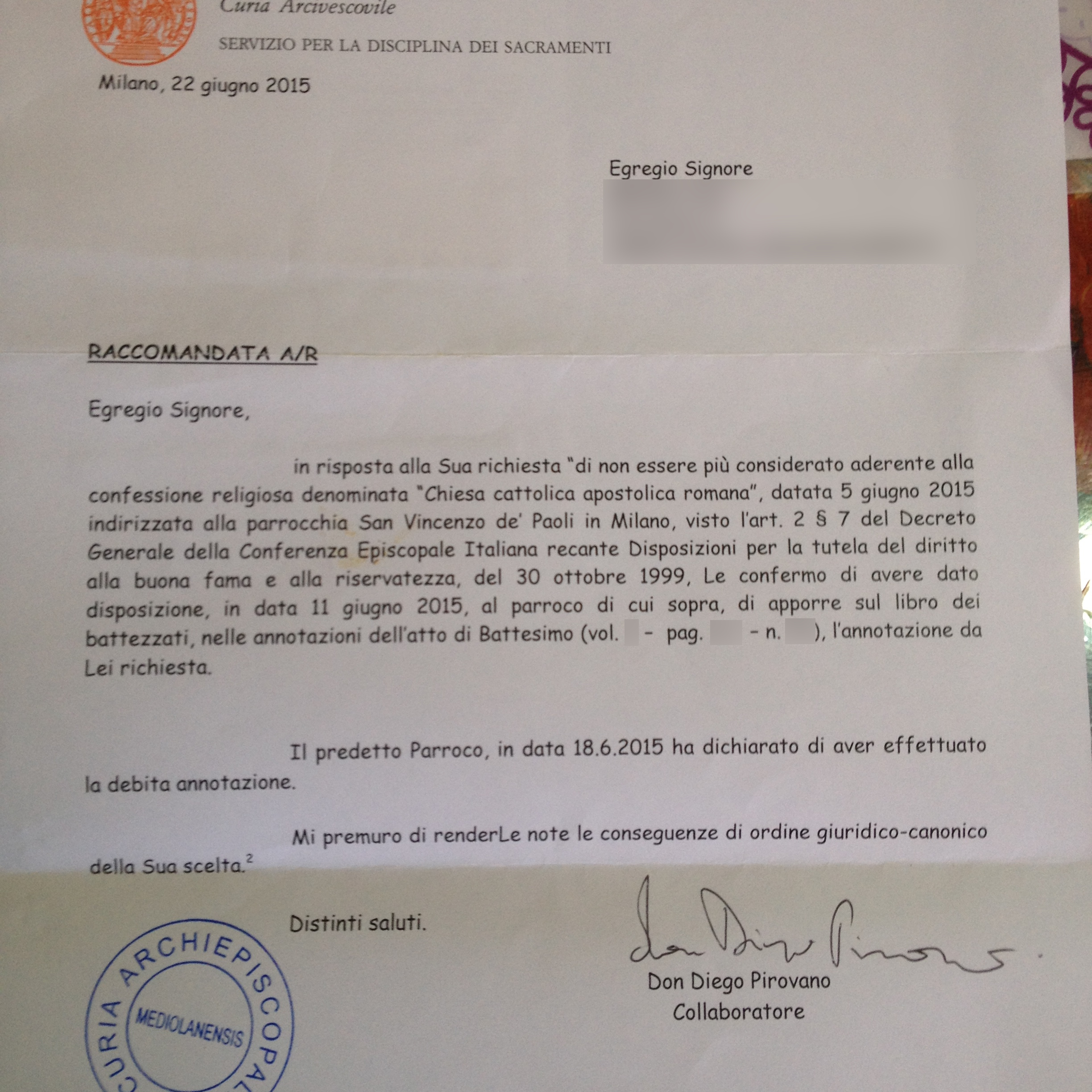 Una persona ha chiesto la rettifica dei dati relativi al proprio battesimo avvenuto a S. Vincenzo De' Paoli - MILANO (MI) il 11/06/2015, dichiarando di non voler più far parte della Chiesa Cattolica.