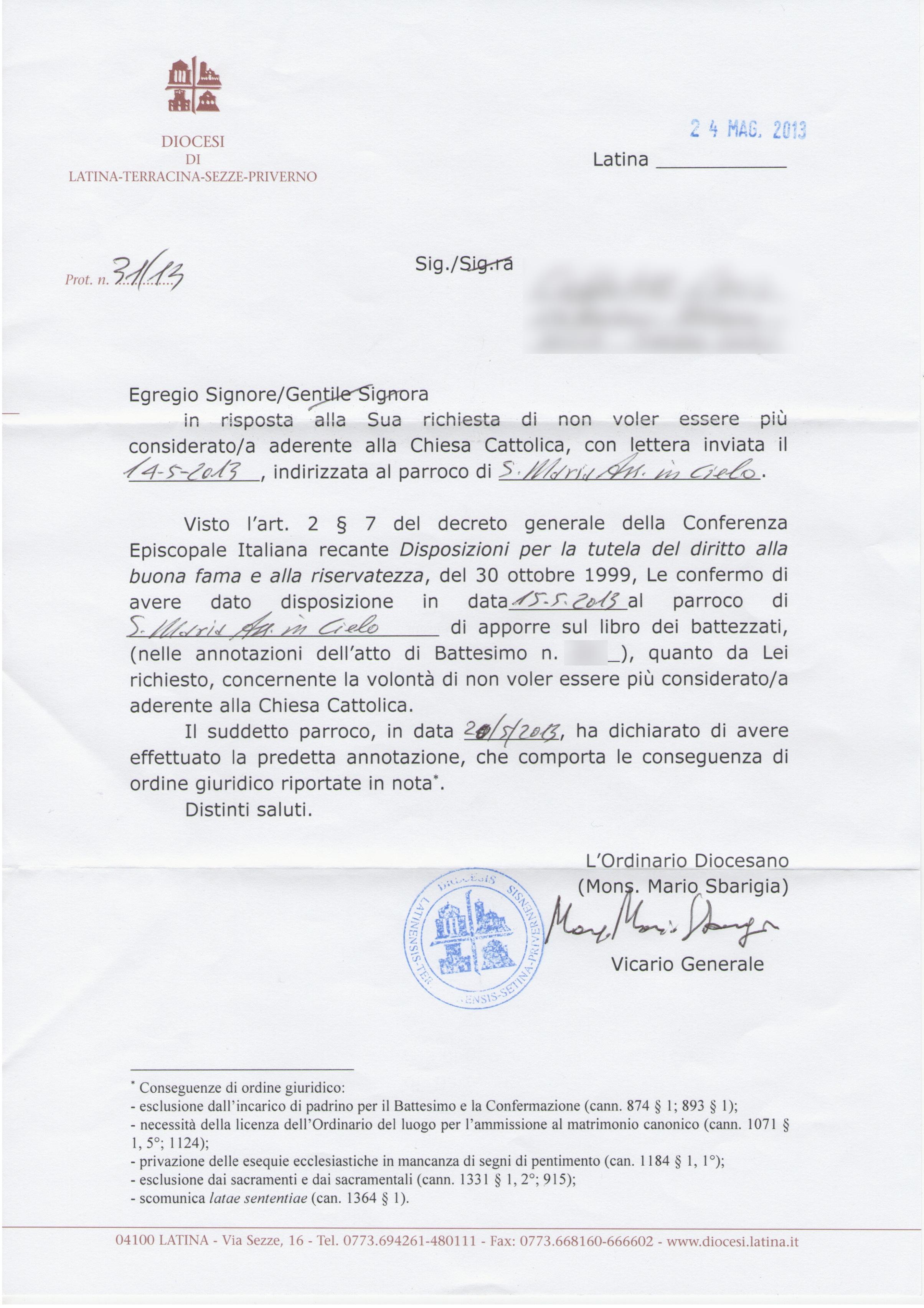 Una persona ha chiesto la rettifica dei dati relativi al proprio battesimo avvenuto a Maria Assunta in Cielo - MAENZA (LT) il 24/05/2013, dichiarando di non voler più far parte della Chiesa Cattolica.