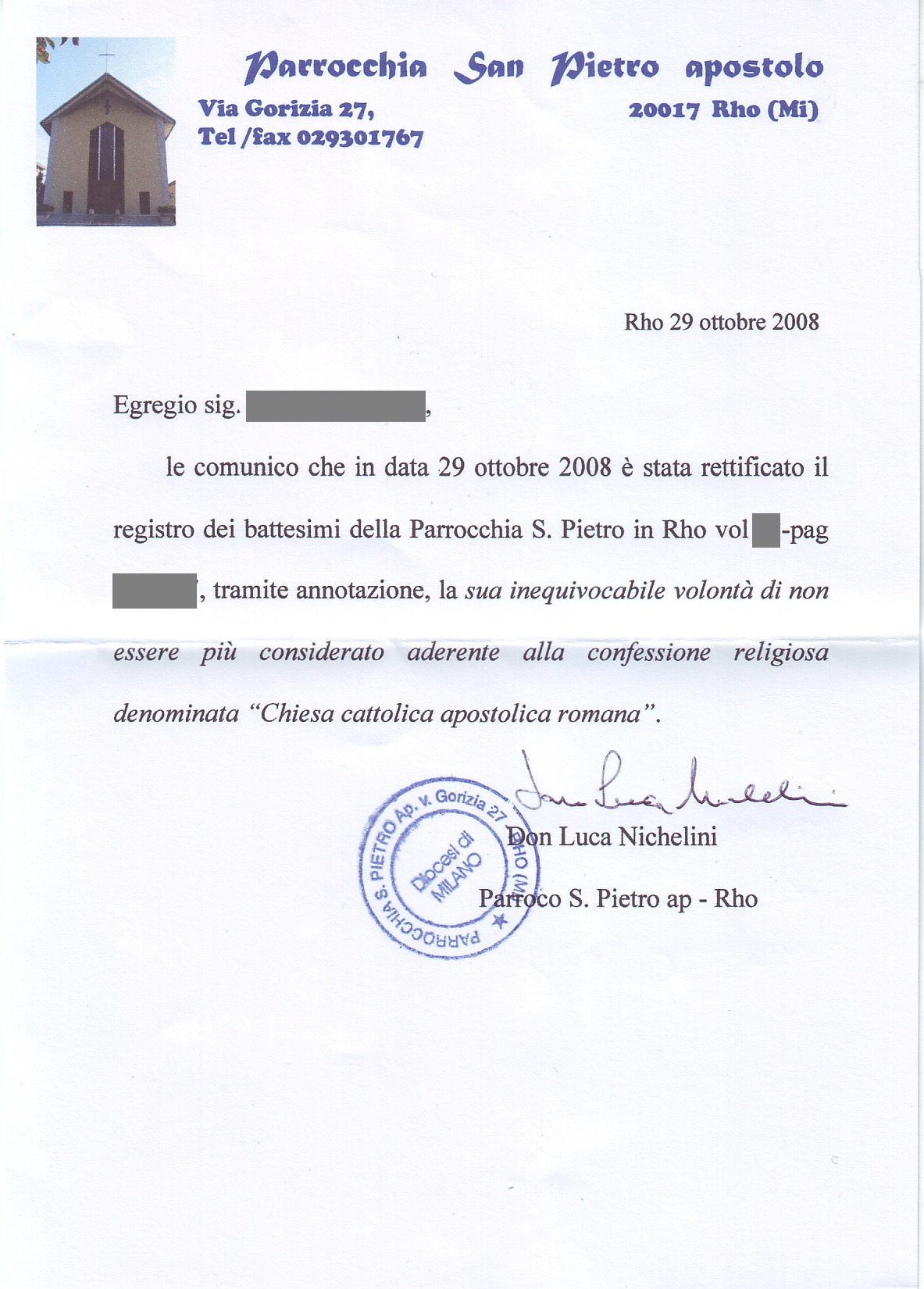 Una persona ha chiesto la rettifica dei dati relativi al proprio battesimo avvenuto a S. Pietro Ap. - RHO (MI) il 29/10/2008, dichiarando di non voler più far parte della Chiesa Cattolica.