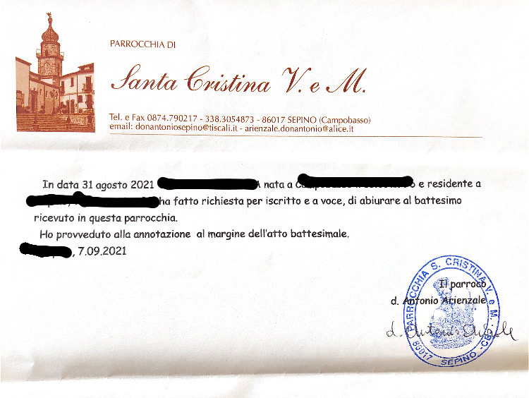 Una persona ha chiesto la rettifica dei dati relativi al proprio battesimo avvenuto a S. Cristina - SEPINO (CB) il 07/09/2021, dichiarando di non voler più far parte della Chiesa Cattolica.