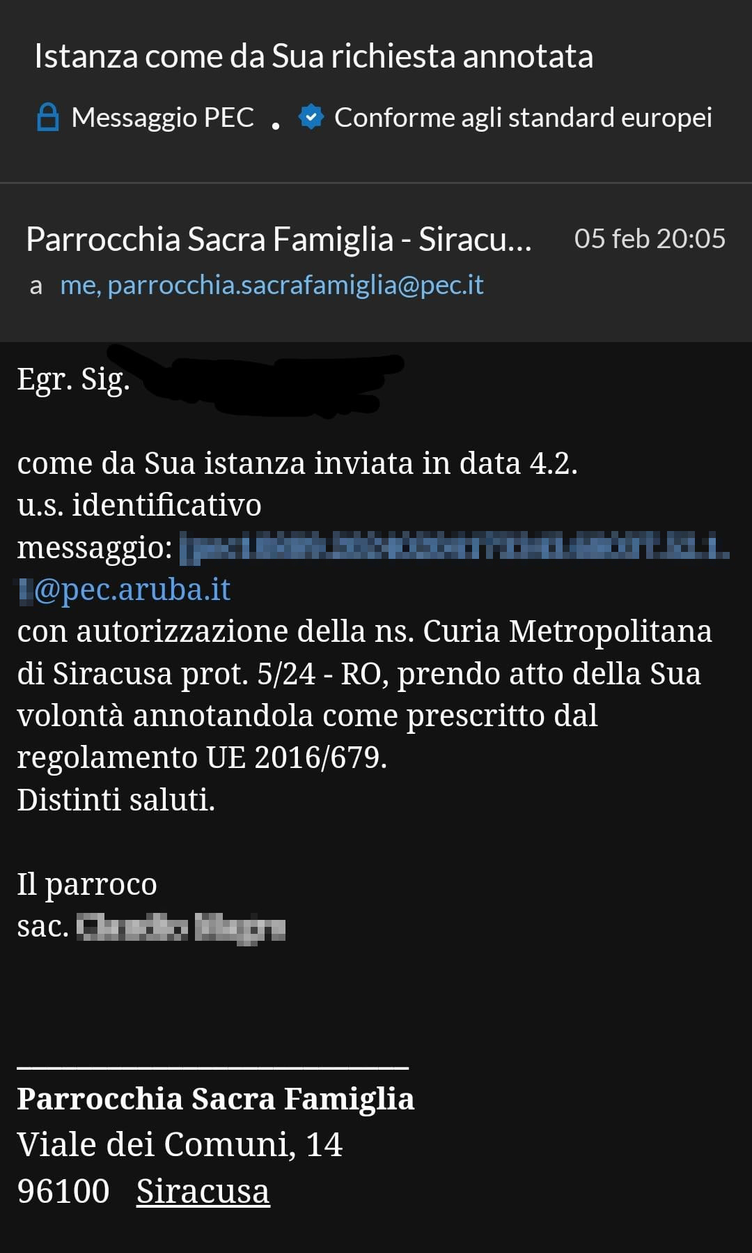 Una persona ha chiesto la rettifica dei dati relativi al proprio battesimo avvenuto a S. Famiglia - SIRACUSA (SR) il 05/02/2024, dichiarando di non voler più far parte della Chiesa Cattolica.
