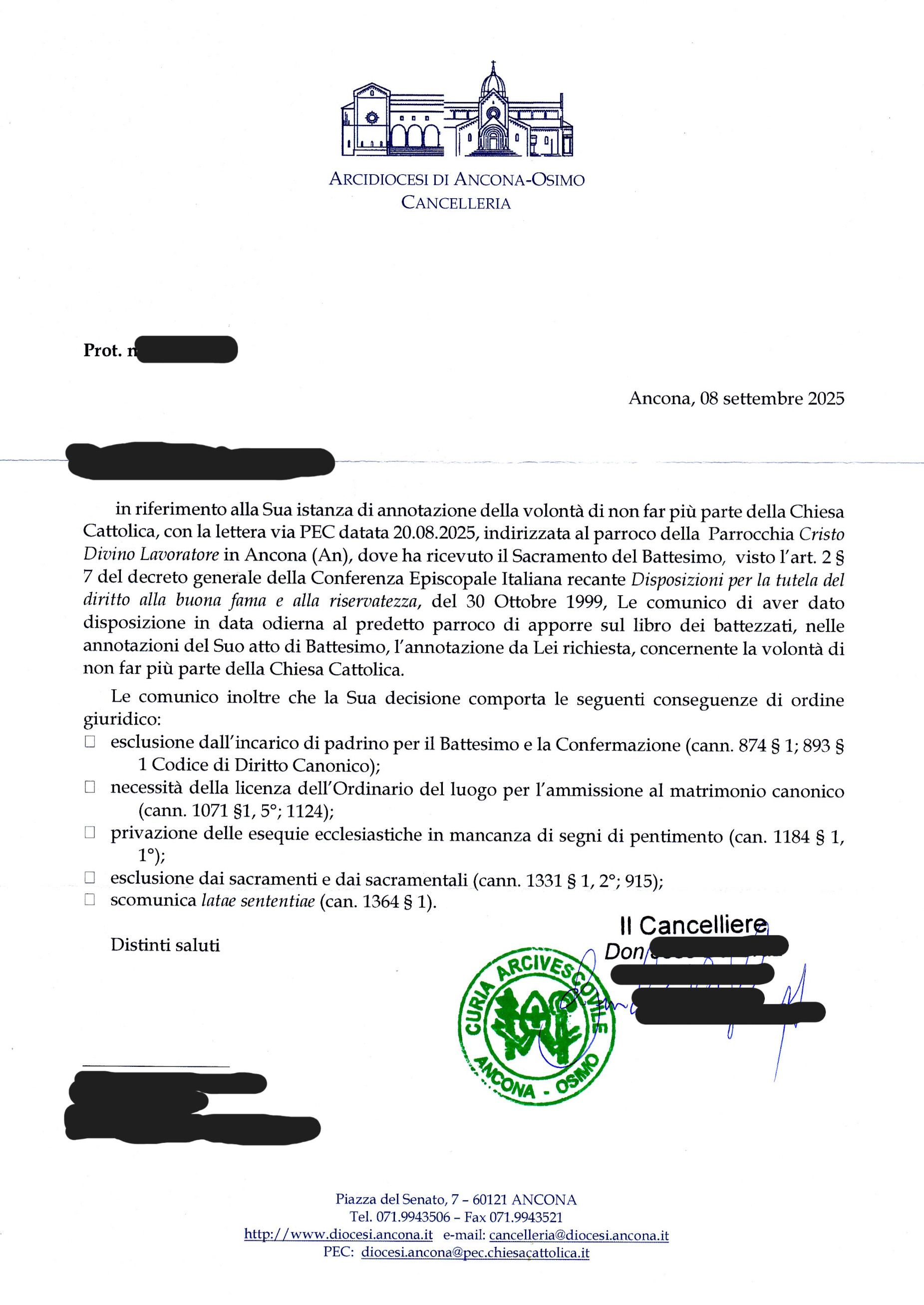 Una persona ha chiesto la rettifica dei dati relativi al proprio battesimo avvenuto a Cristo Divino Lavoratore - ANCONA (AN) il 08/09/2025, dichiarando di non voler più far parte della Chiesa Cattolica.