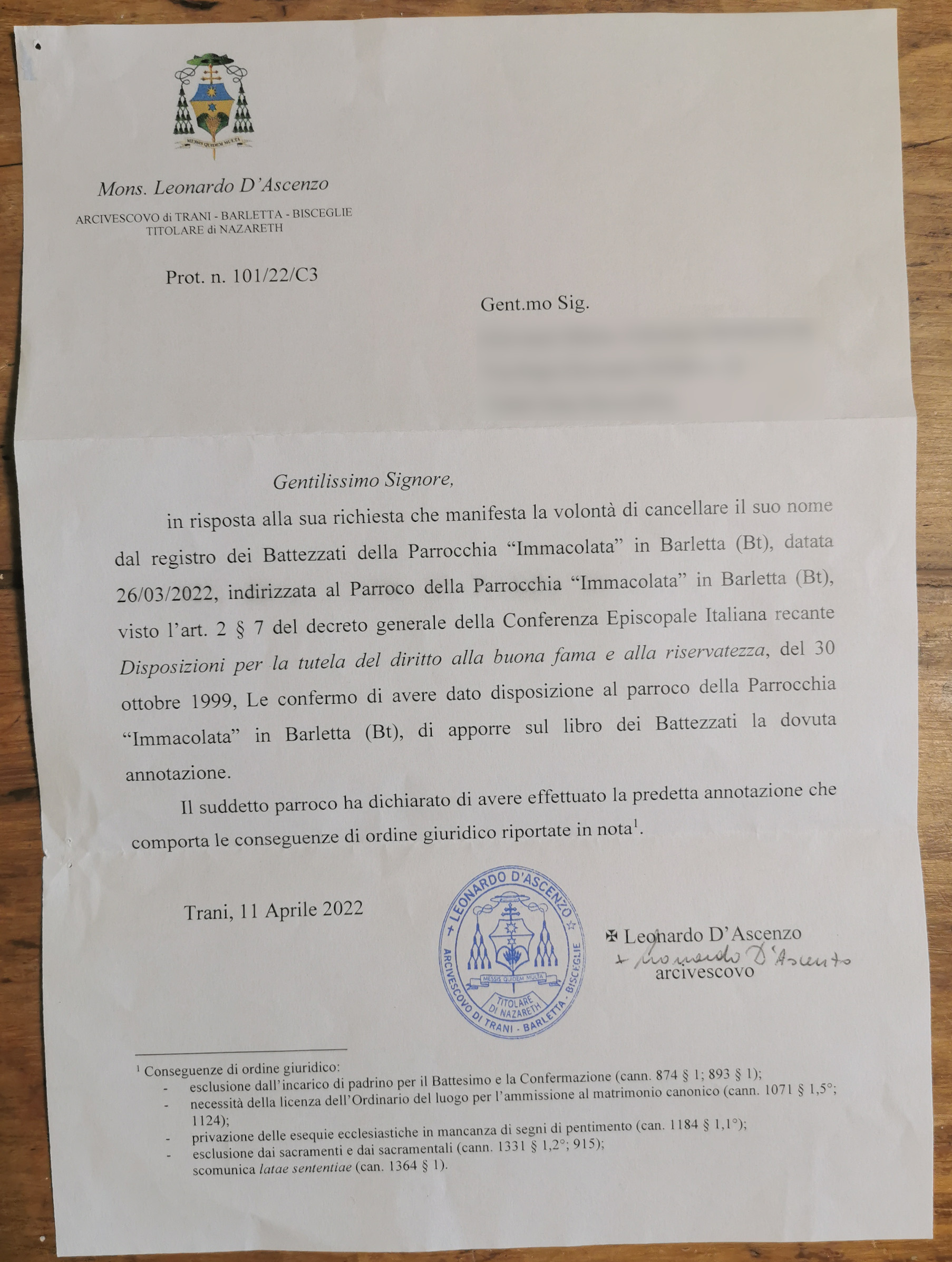 Dopo vari tentativi, non conoscendo precisamente data e parrocchia di battesimo, oggi mi è finalmente arrivata la raccomandata dall'arcivescovo, datata 11/4/22, giorno dal quale farò decorrere l'ufficialità della mia apostasia. Sbattezzatevi! È importante! Un cordiale e ateo saluto a tutti.