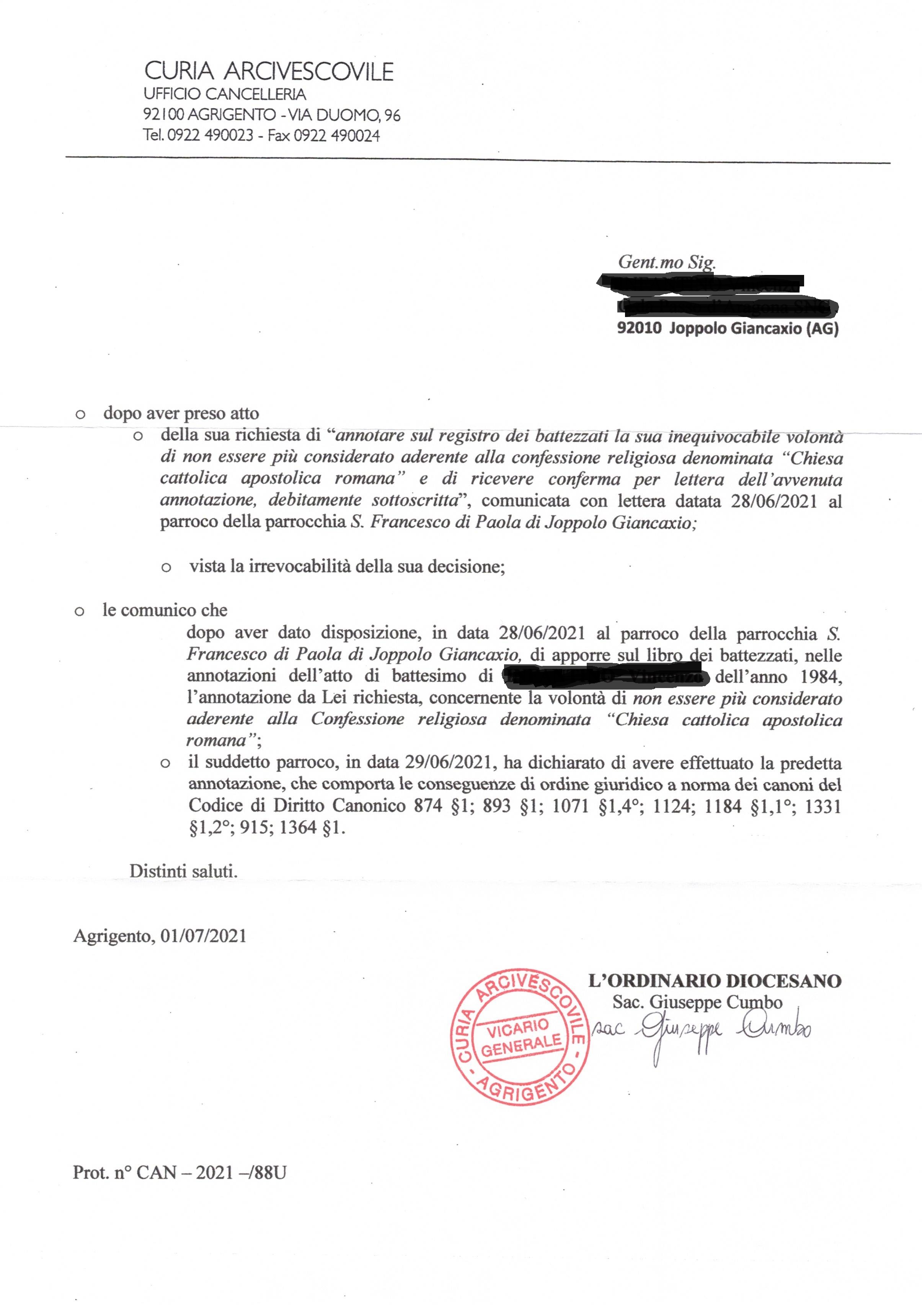Una persona ha chiesto la rettifica dei dati relativi al proprio battesimo avvenuto a S. Francesco di Paola - JOPPOLO GIANCAXIO (AG) il 29/06/2021, dichiarando di non voler più far parte della Chiesa Cattolica.