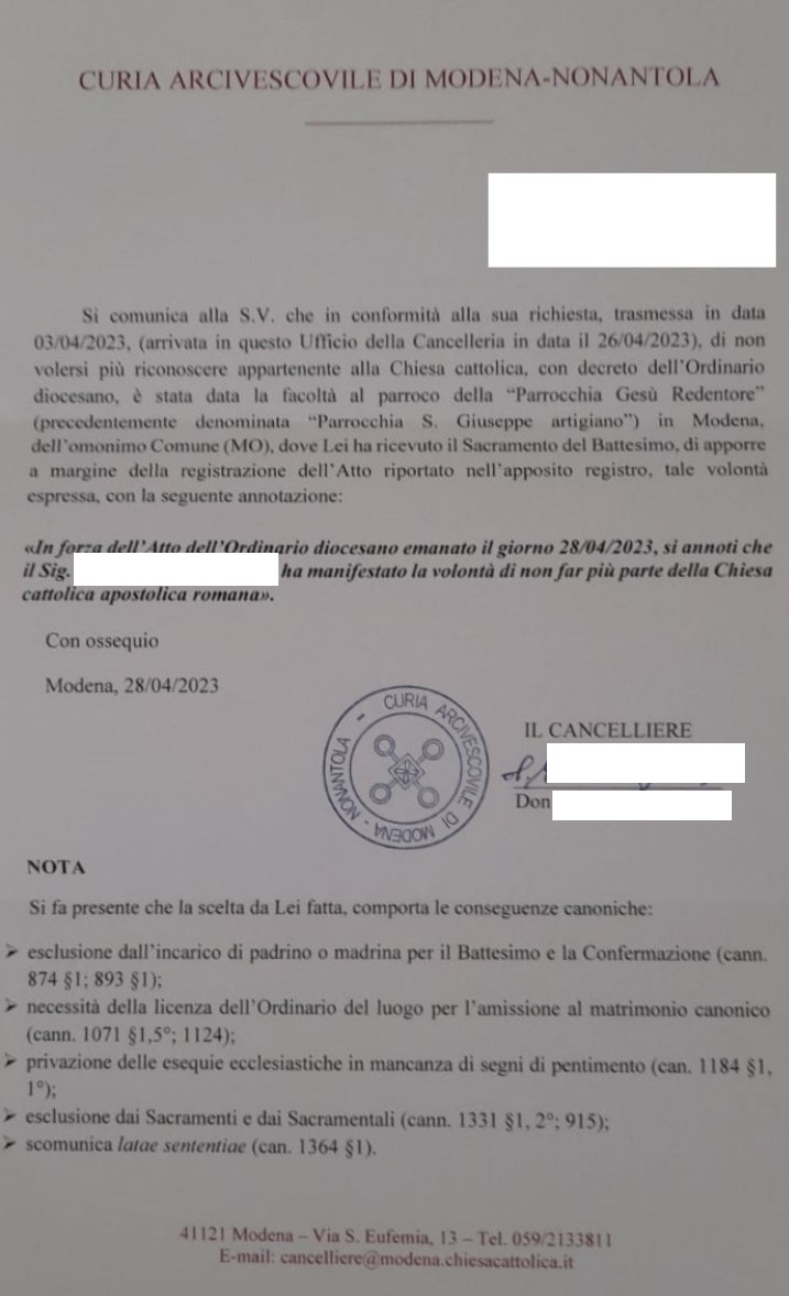 Una persona ha chiesto la rettifica dei dati relativi al proprio battesimo avvenuto a Gesù Redentore - MODENA (MO) il 28/04/2023, dichiarando di non voler più far parte della Chiesa Cattolica.