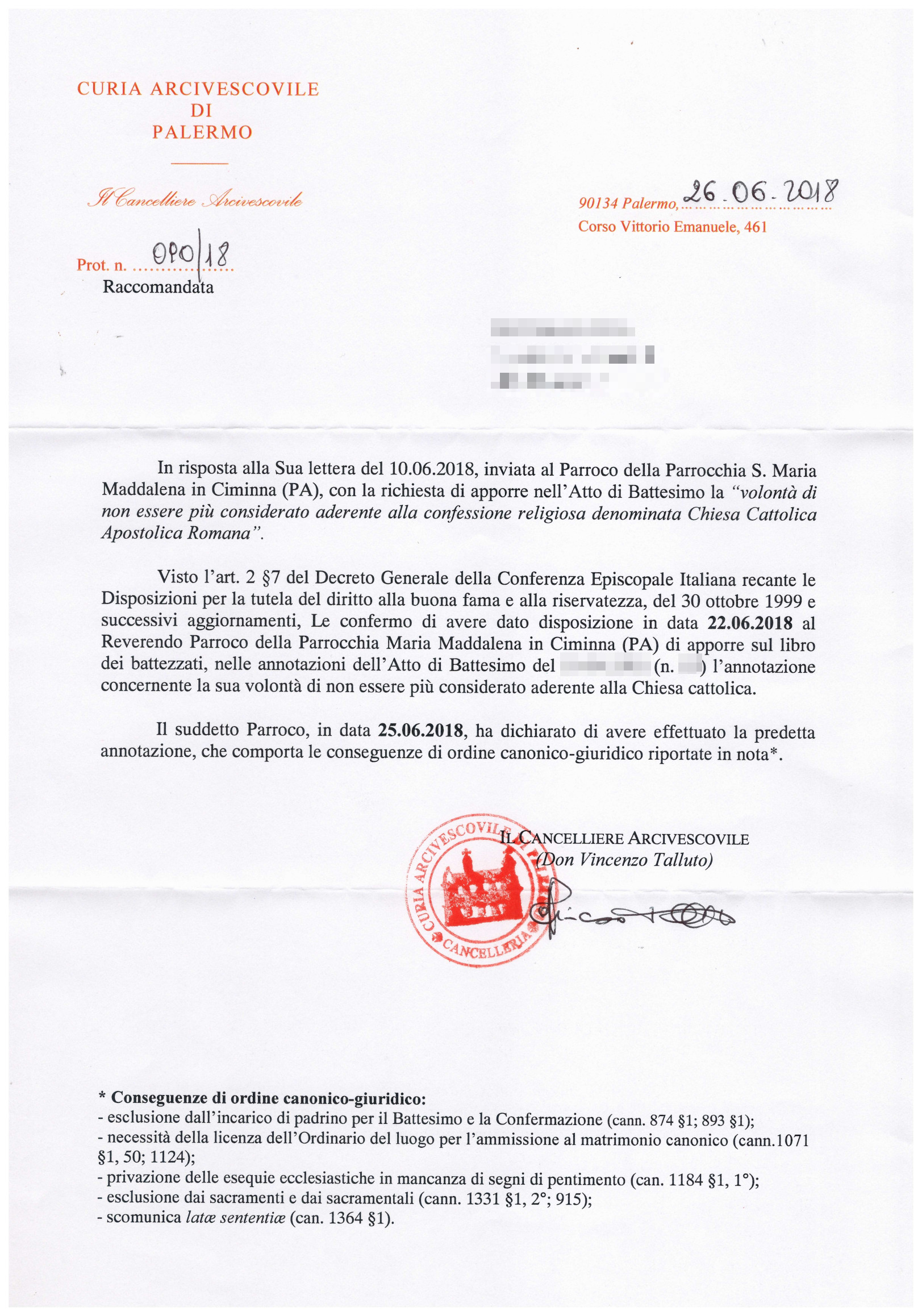 Una persona ha chiesto la rettifica dei dati relativi al proprio battesimo avvenuto a S. Maria Maddalena - CIMINNA (PA) il 29/06/2018, dichiarando di non voler più far parte della Chiesa Cattolica.