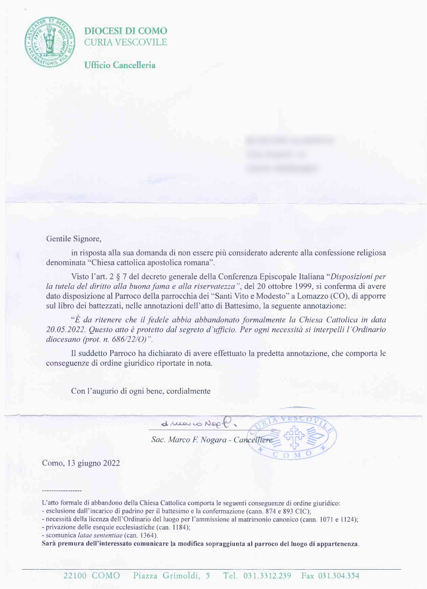 Una persona ha chiesto la rettifica dei dati relativi al proprio battesimo avvenuto a S. Siro - LOMAZZO (CO) il 27/06/2022, dichiarando di non voler più far parte della Chiesa Cattolica.