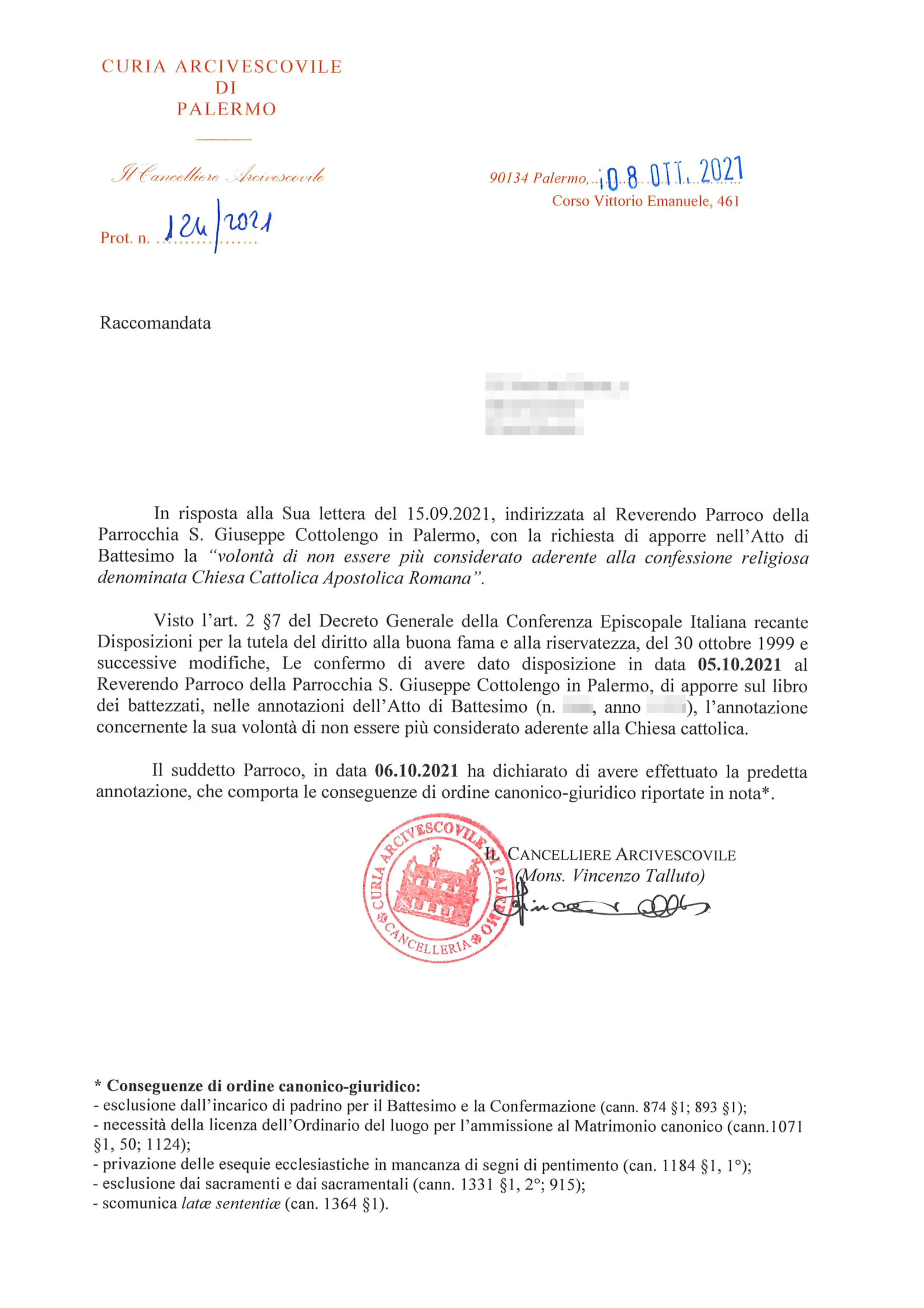 Una persona ha chiesto la rettifica dei dati relativi al proprio battesimo avvenuto a S. Giuseppe Cottolengo - PALERMO (PA) il 08/10/2021, dichiarando di non voler più far parte della Chiesa Cattolica.