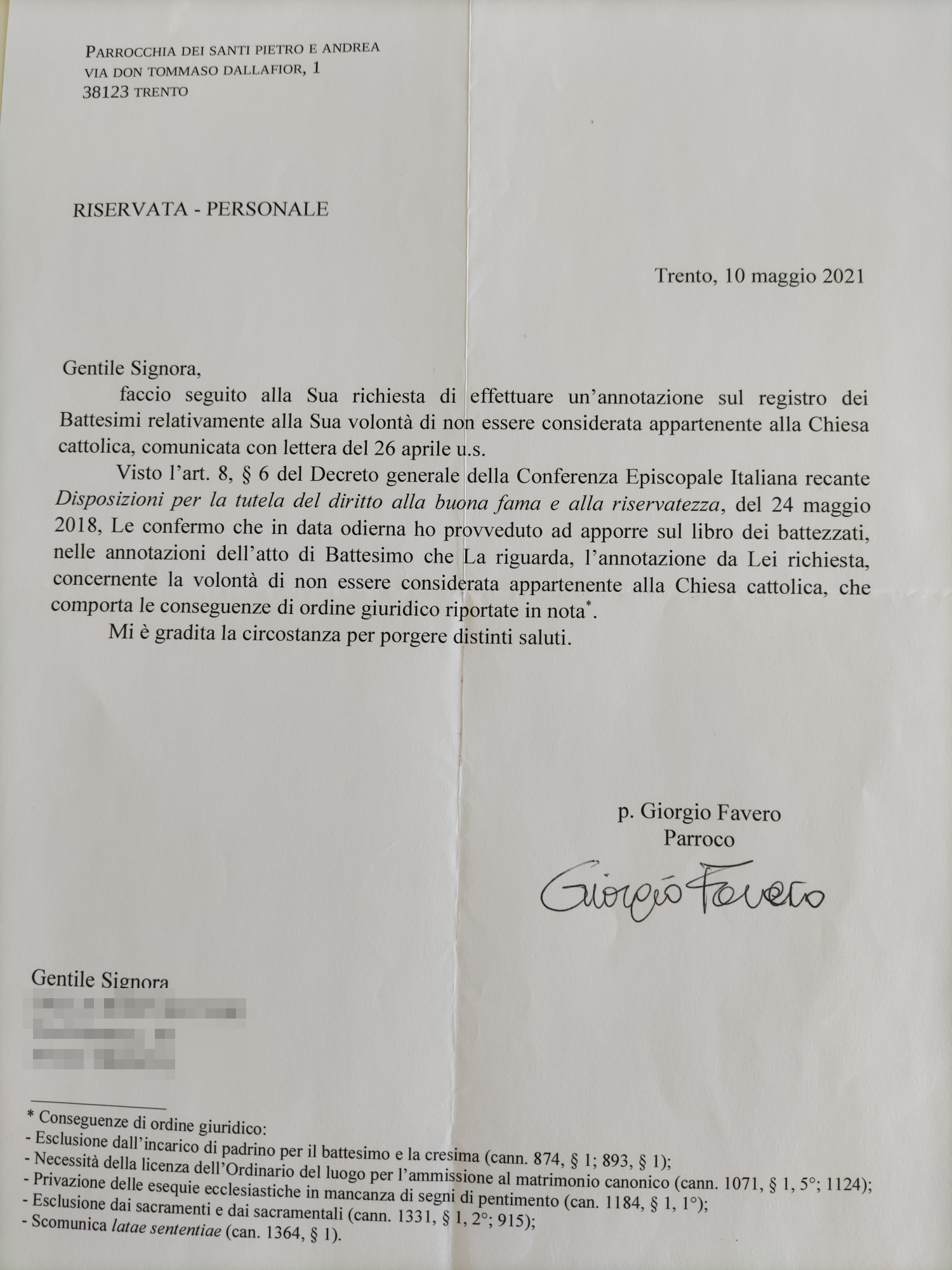 Una persona ha chiesto la rettifica dei dati relativi al proprio battesimo avvenuto a Santi Pietro e Andrea - TRENTO (TN) il 10/05/2021, dichiarando di non voler più far parte della Chiesa Cattolica.
