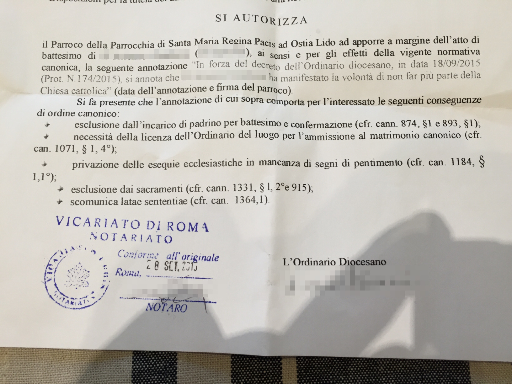 Una persona ha chiesto la rettifica dei dati relativi al proprio battesimo avvenuto a S. Nicola di Bari - ROMA (RM) il 10/09/2013, dichiarando di non voler più far parte della Chiesa Cattolica.