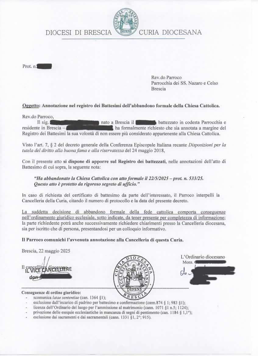 Una persona ha chiesto la rettifica dei dati relativi al proprio battesimo avvenuto a Santi Nazaro e Celso - BRESCIA (BS) il 03/06/2025, dichiarando di non voler più far parte della Chiesa Cattolica.