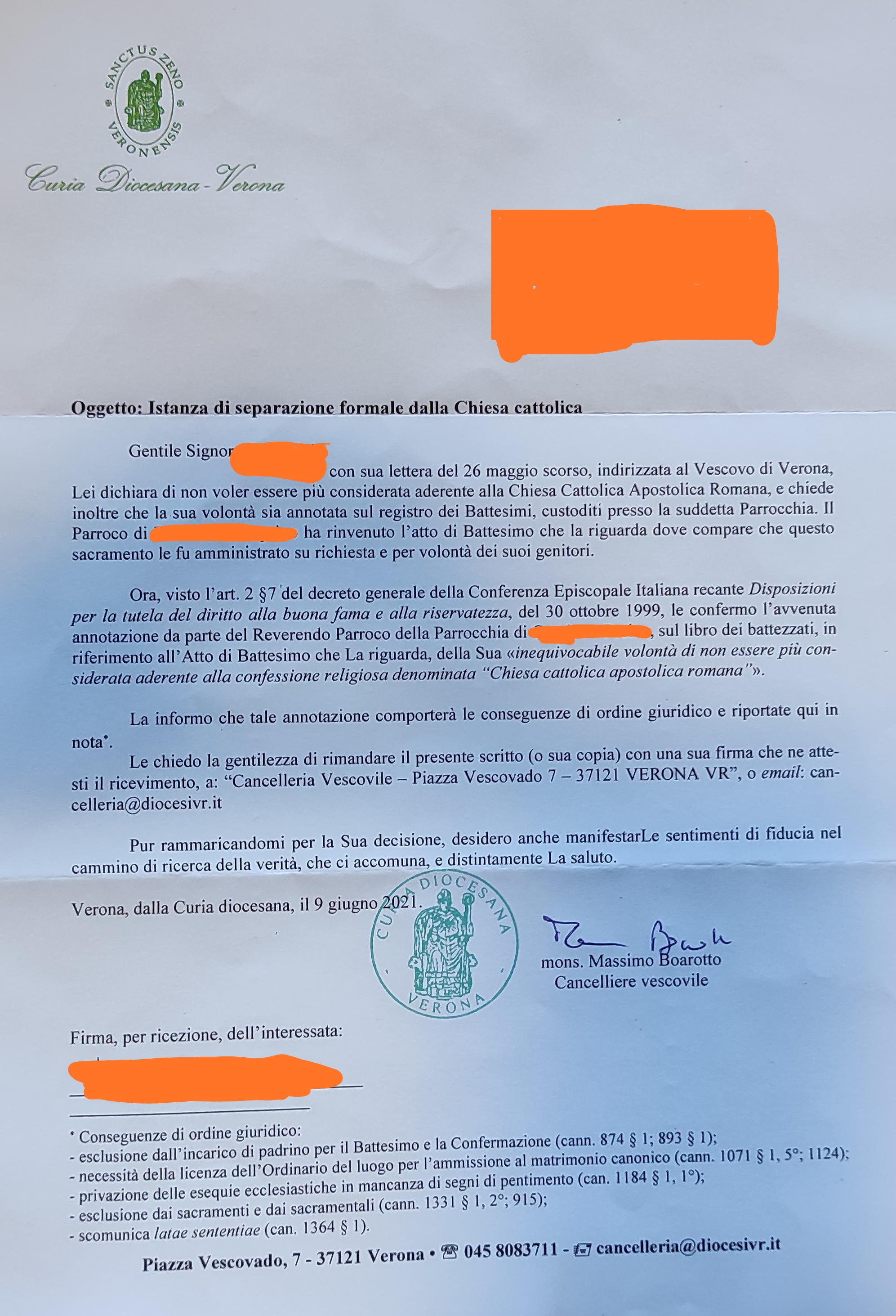 Sin da bambina ho avuto dubbi sulla chiesa, sui loro modi di fare e sulla storia che raccontavano. Più crescevo più capivo, finché arrivai all'odio per questa istituzione. Ora che sono una persona adulta, l'odio è passato ma lo schifo no. Con questa scomunica, sono finalmente uscita dalla setta e non faccio più parte dei loro numeri!