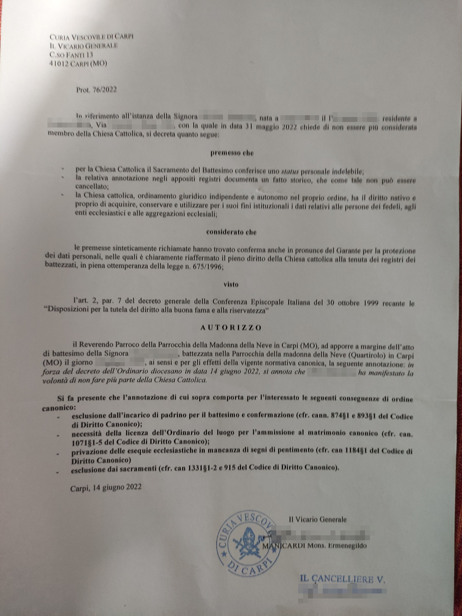 Una persona ha chiesto la rettifica dei dati relativi al proprio battesimo avvenuto a Madonna della Neve - CARPI (MO) il 14/06/2022, dichiarando di non voler più far parte della Chiesa Cattolica.