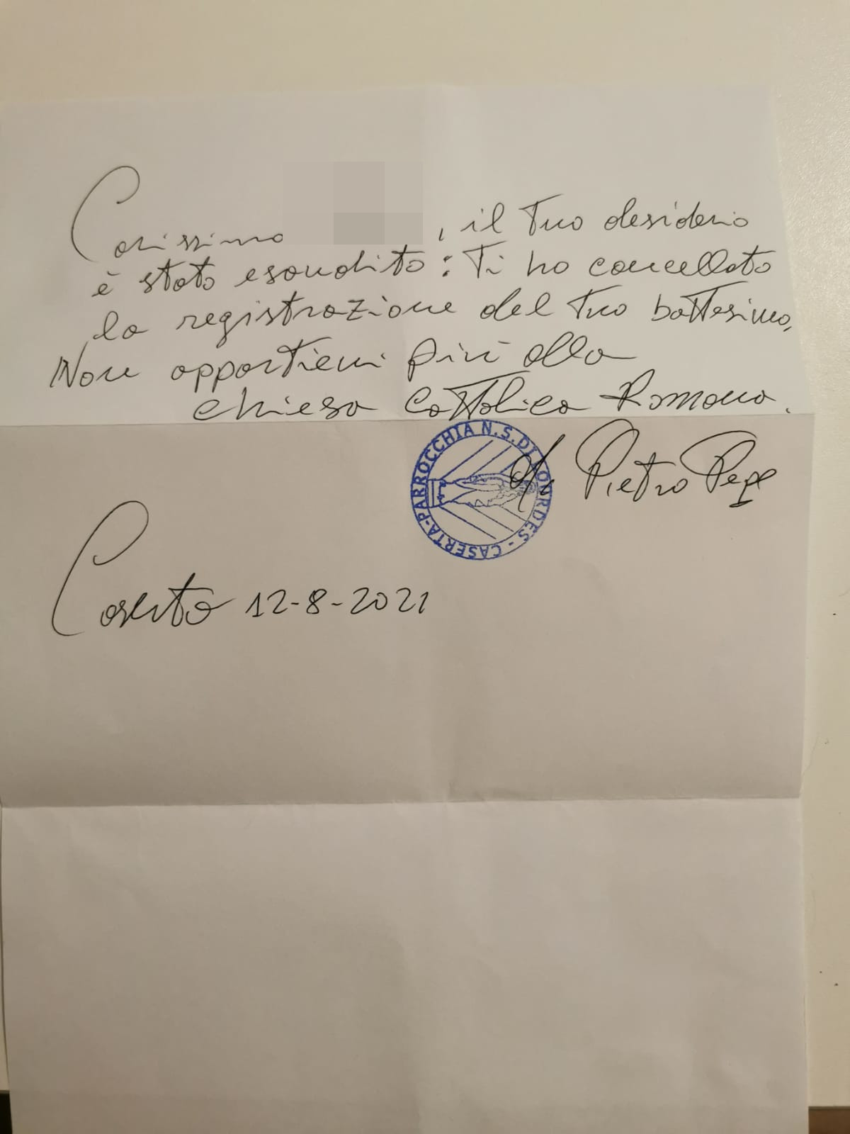 Una persona ha chiesto la rettifica dei dati relativi al proprio battesimo avvenuto a Nostra Signora di Lourdes - CASERTA (CE) il 12/08/2021, dichiarando di non voler più far parte della Chiesa Cattolica.