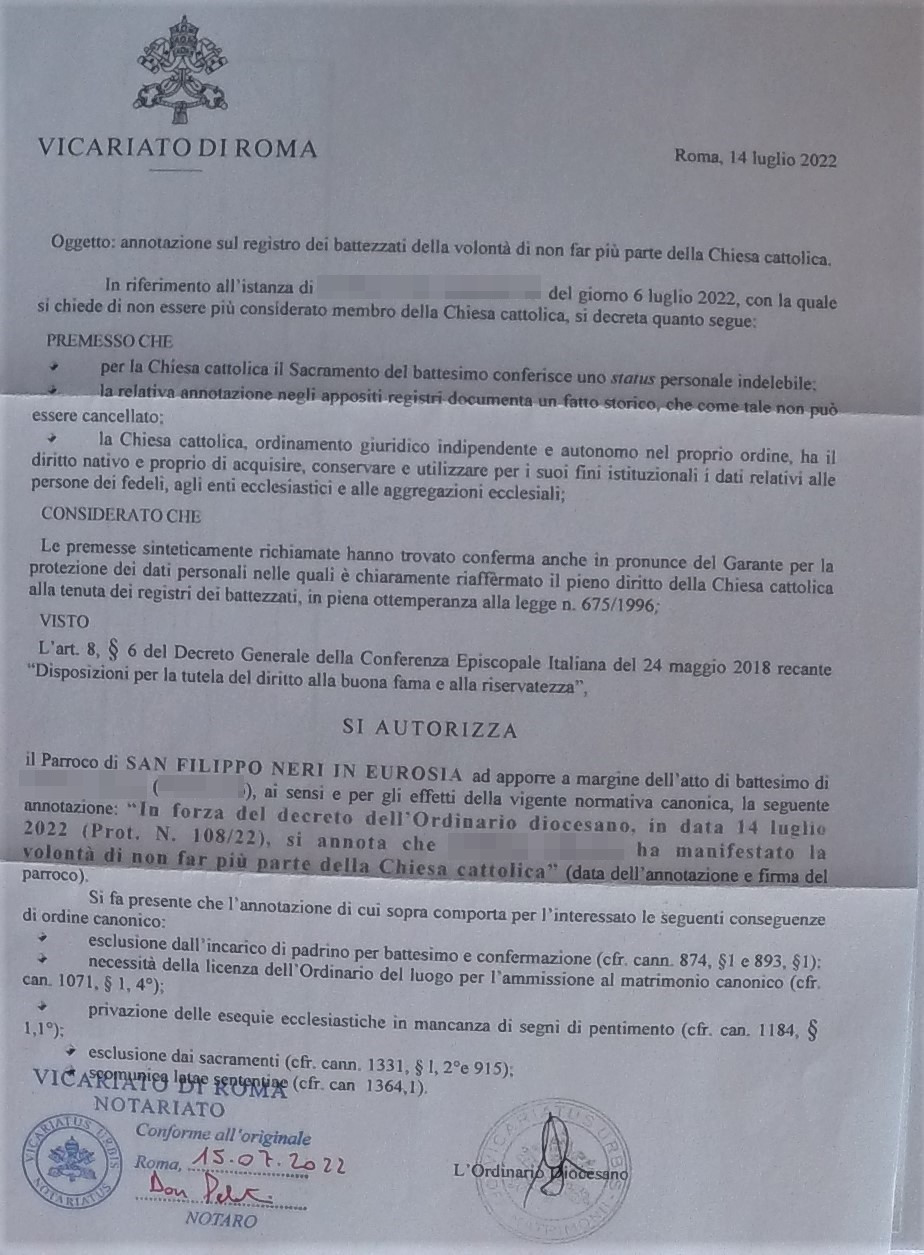 Una persona ha chiesto la rettifica dei dati relativi al proprio battesimo avvenuto a Gesù Divino Maestro - ROMA (RM) il 14/07/2022, dichiarando di non voler più far parte della Chiesa Cattolica.
