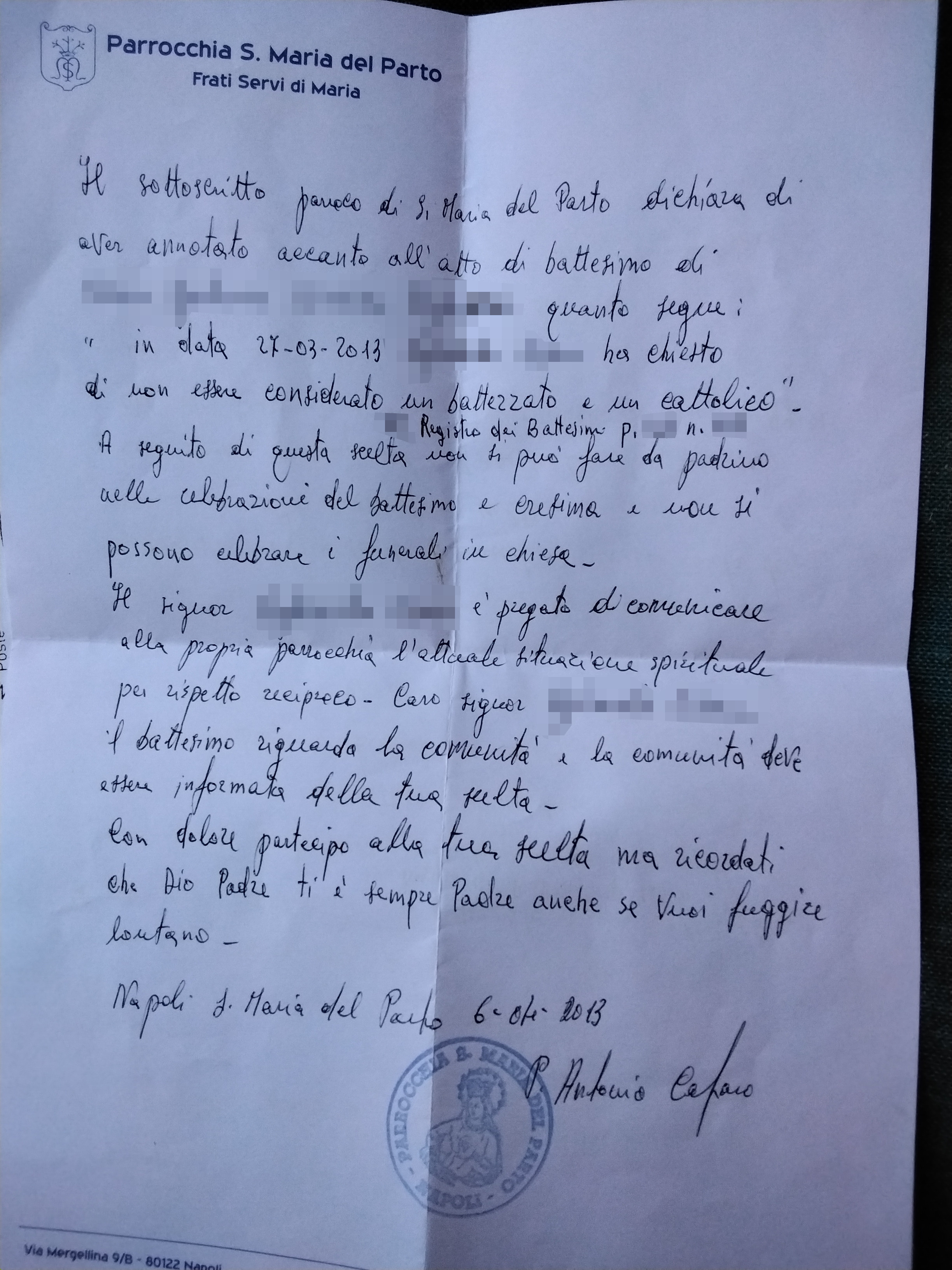Una persona ha chiesto la rettifica dei dati relativi al proprio battesimo avvenuto a S. Maria del Parto - NAPOLI (NA) il 08/04/2013, dichiarando di non voler più far parte della Chiesa Cattolica.