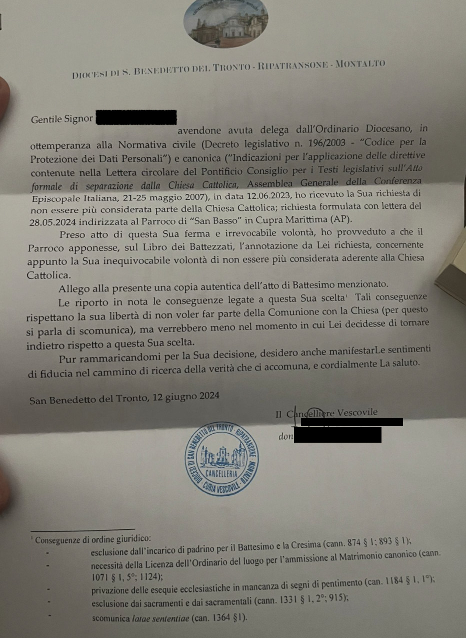 Una persona ha chiesto la rettifica dei dati relativi al proprio battesimo avvenuto a S. Basso - CUPRA MARITTIMA (AP) il 12/06/2024, dichiarando di non voler più far parte della Chiesa Cattolica.