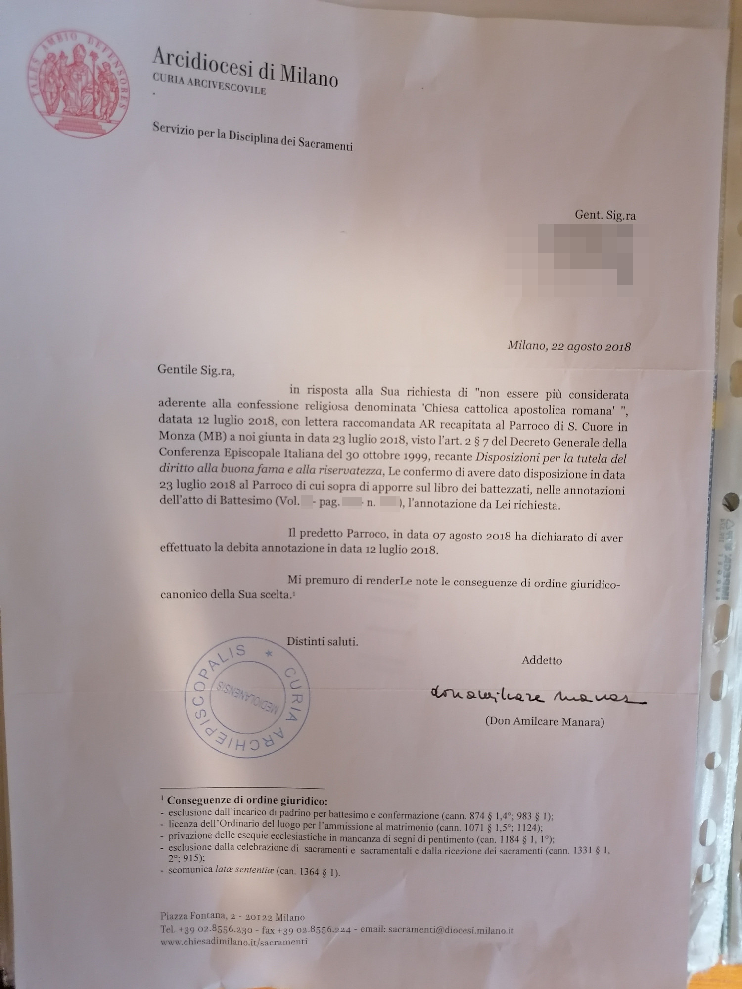 Una persona ha chiesto la rettifica dei dati relativi al proprio battesimo avvenuto a Sacro Cuore al Triante - MONZA (MB) il 22/08/2018, dichiarando di non voler più far parte della Chiesa Cattolica.