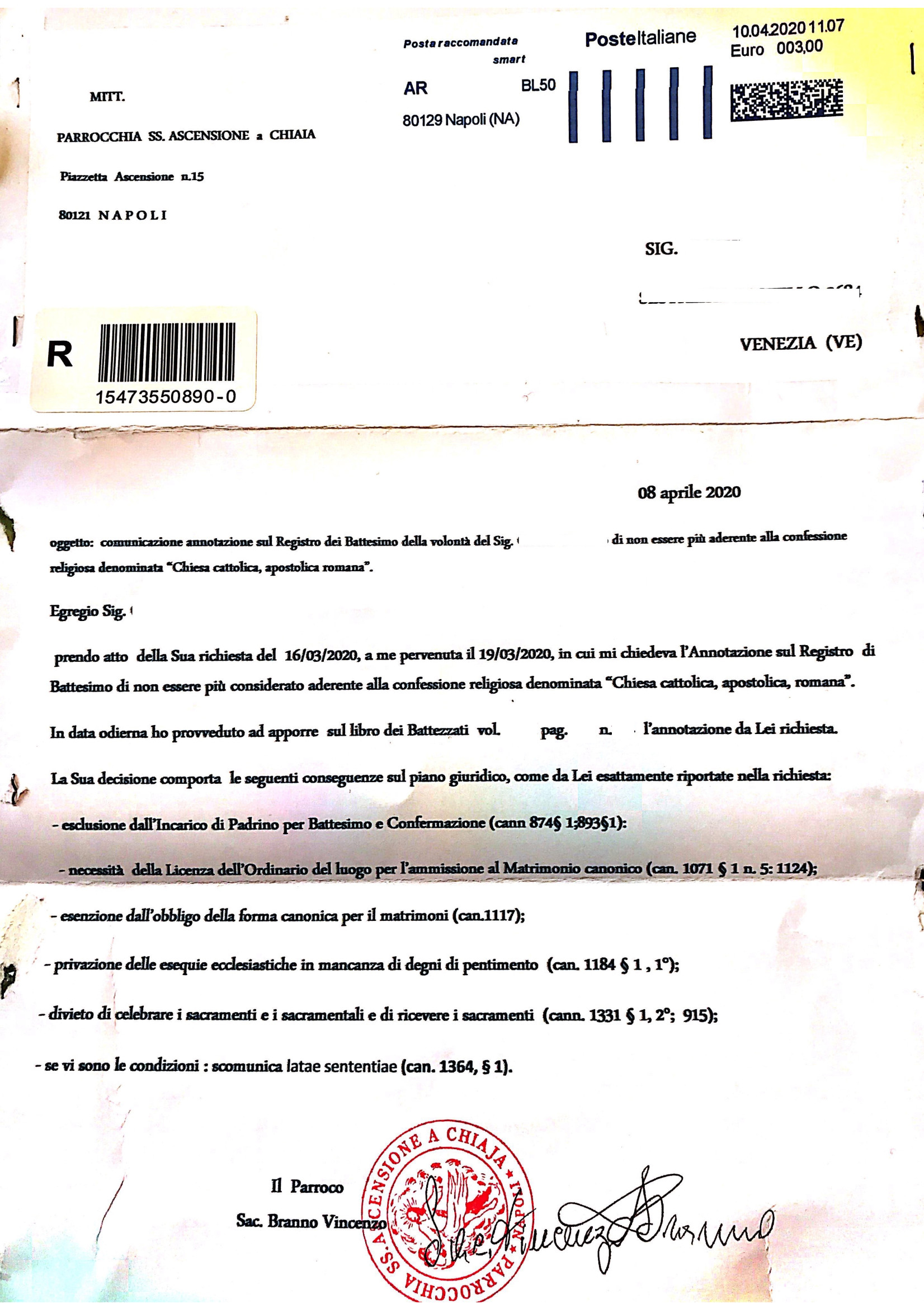 Ho inviato tre richieste di "sbattezzo" senza ricevere risposta a partire dal 2009. Mi sono rivolto anche all'Autorità Garante per la protezione dei dati personali, ma la pratica per costringere il parroco a rispondere era lunga e costosa. Ho provato ancora una volta nel 2020 e ho ricevuto la risposta pochi giorni dopo. Molto probabilmente, il parroco è cambiato e chi mi ha risposto è stato molto più attento.