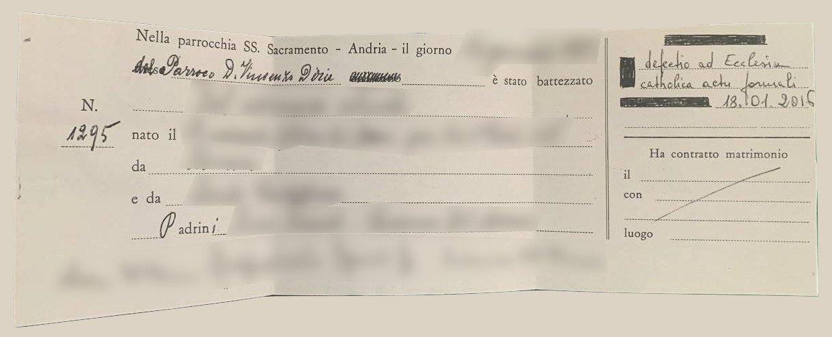 Una persona ha chiesto la rettifica dei dati relativi al proprio battesimo avvenuto a Ss. Sacramento - ANDRIA (BT) il 18/01/2016, dichiarando di non voler più far parte della Chiesa Cattolica.