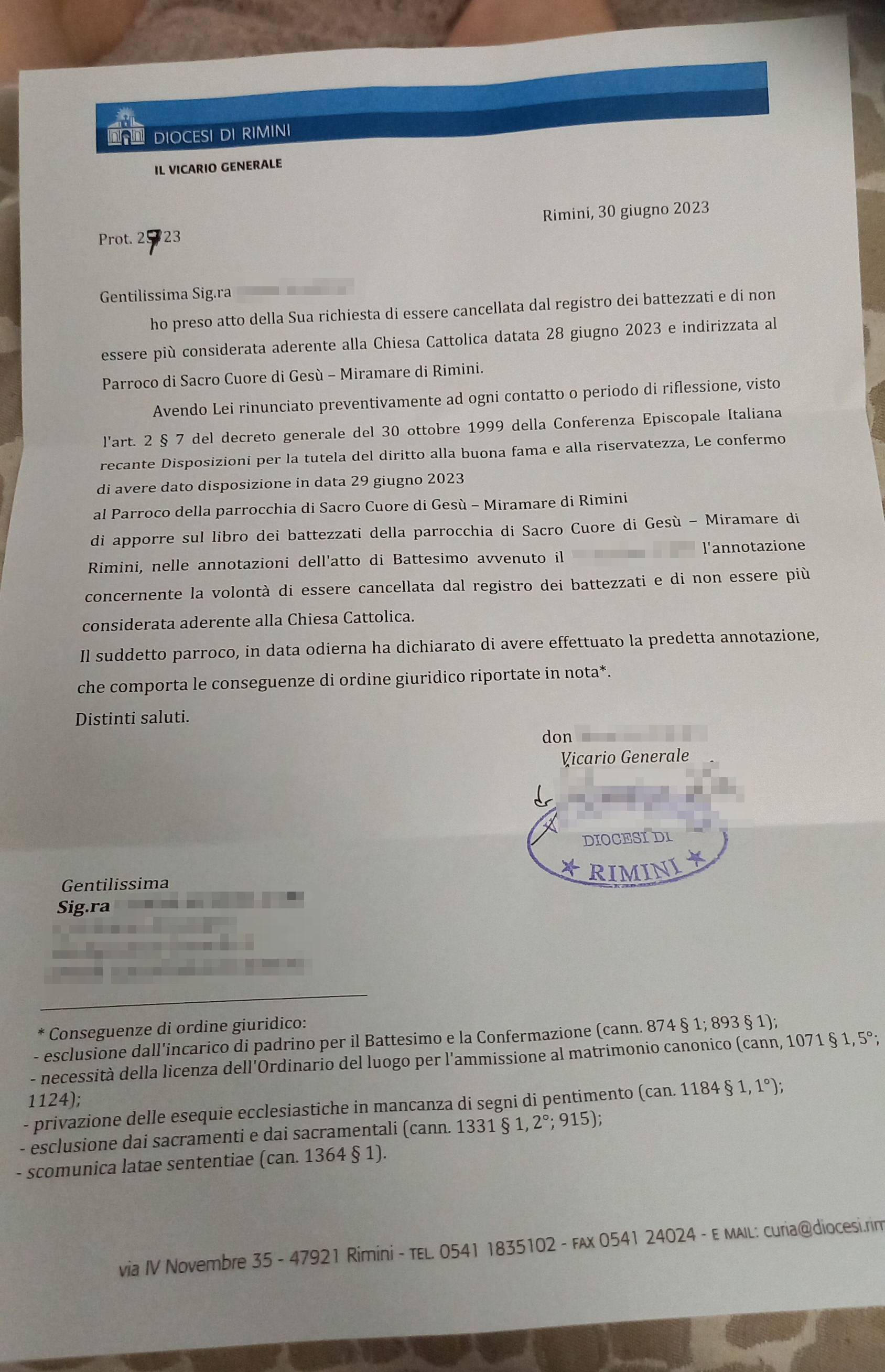 Una persona ha chiesto la rettifica dei dati relativi al proprio battesimo avvenuto a Sacro Cuore di Gesù - RIMINI (RN) il 05/07/2023, dichiarando di non voler più far parte della Chiesa Cattolica.