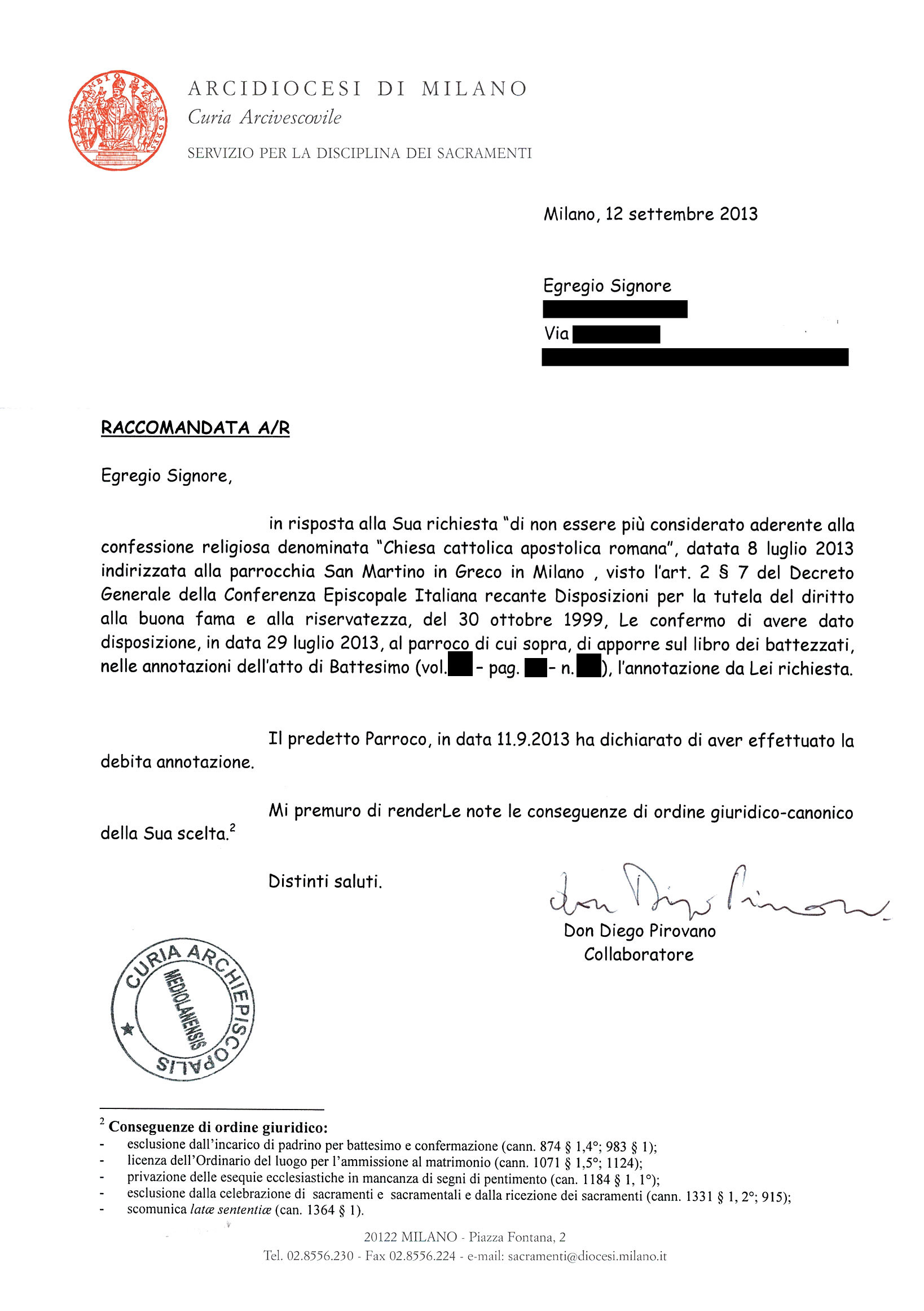 Una persona ha chiesto la rettifica dei dati relativi al proprio battesimo avvenuto a S. Martino in Greco - MILANO (MI) il 12/09/2013, dichiarando di non voler più far parte della Chiesa Cattolica.