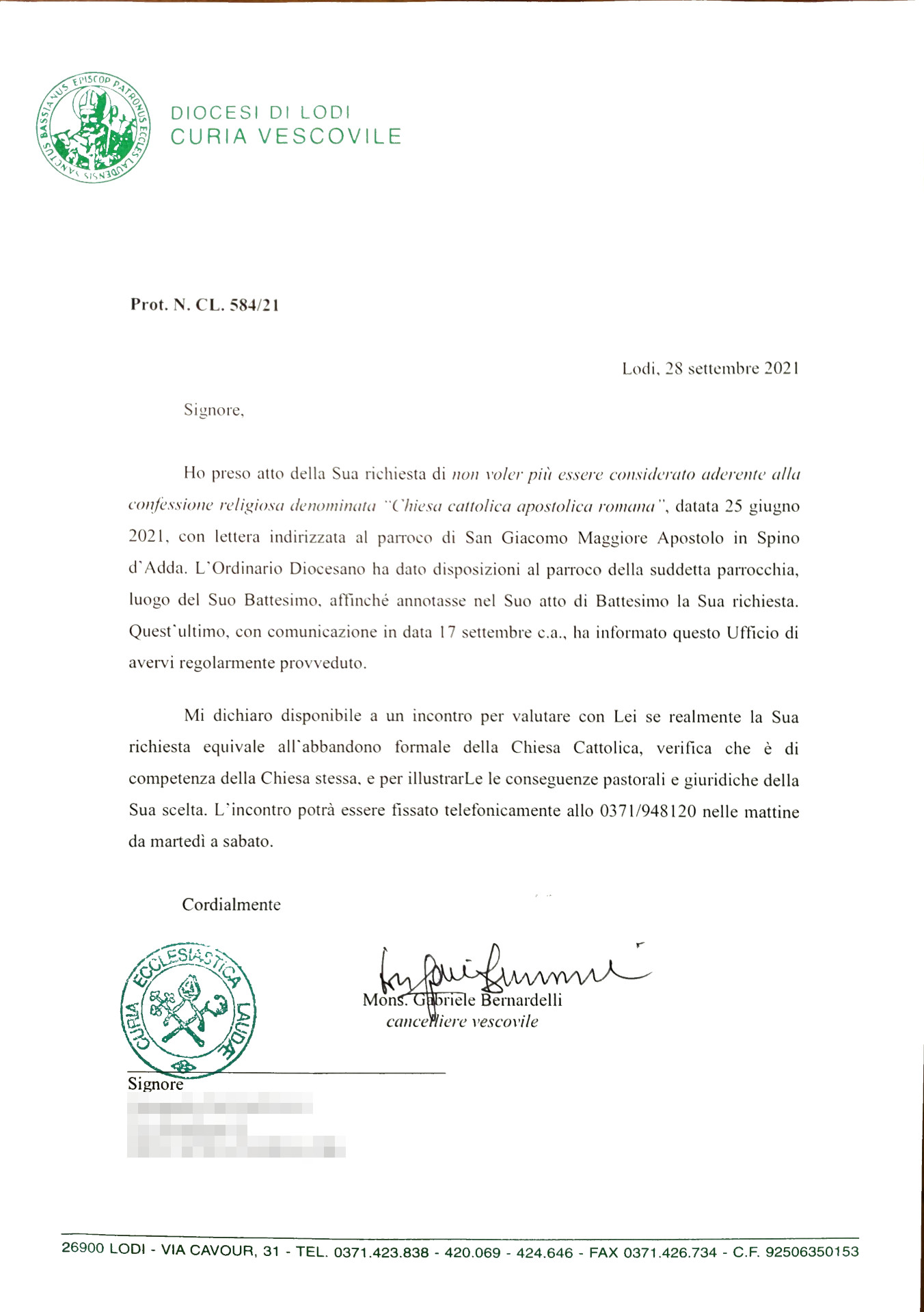 Una persona ha chiesto la rettifica dei dati relativi al proprio battesimo avvenuto a S. Giacomo Maggiore Apostolo - SPINO D'ADDA (CR) il 28/09/2021, dichiarando di non voler più far parte della Chiesa Cattolica.