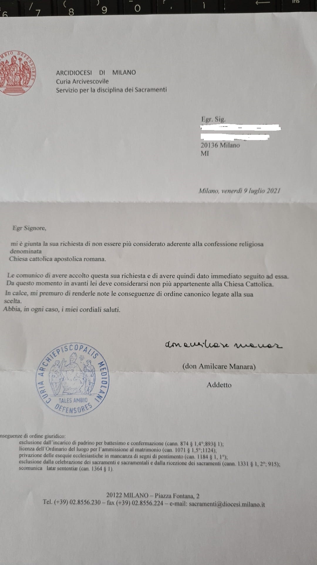 Una persona ha chiesto la rettifica dei dati relativi al proprio battesimo avvenuto a S. Protaso - MILANO (MI) il 12/07/2021, dichiarando di non voler più far parte della Chiesa Cattolica.