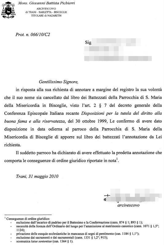 Una persona ha chiesto la rettifica dei dati relativi al proprio battesimo avvenuto a S. Maria Madre di Misericordia - BISCEGLIE (BT) il 31/05/2010, dichiarando di non voler più far parte della Chiesa Cattolica.