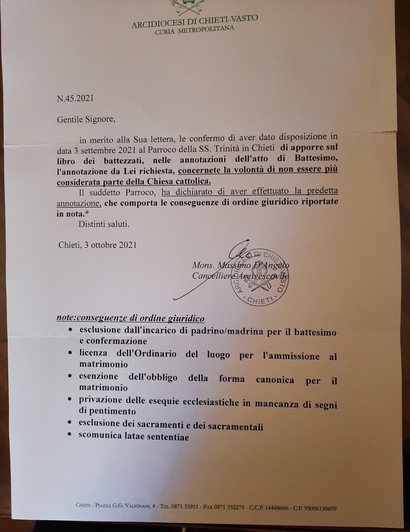 Una persona ha chiesto la rettifica dei dati relativi al proprio battesimo avvenuto a Ss. Trinità - CHIETI (CH) il 19/10/2021, dichiarando di non voler più far parte della Chiesa Cattolica.