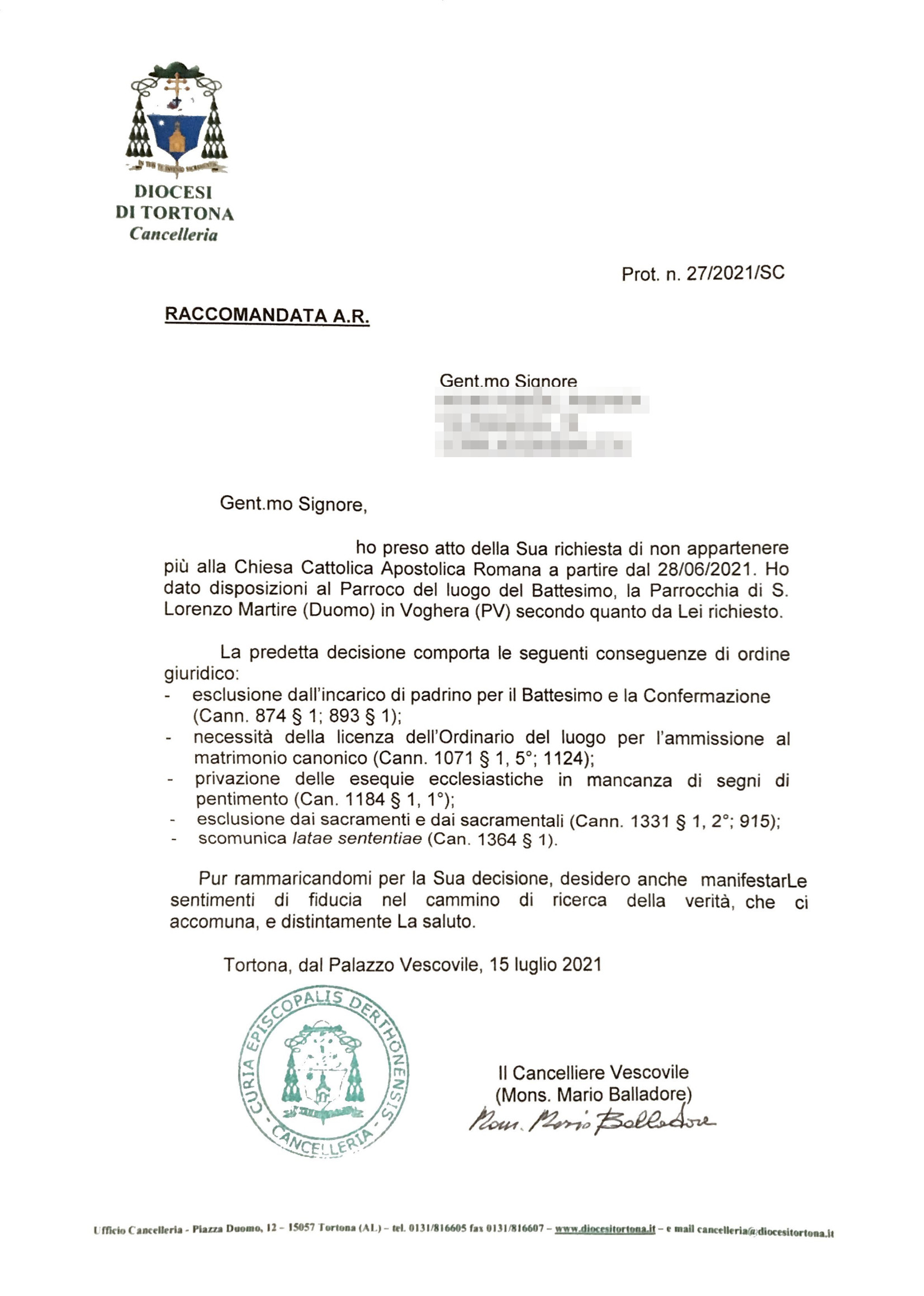 Una persona ha chiesto la rettifica dei dati relativi al proprio battesimo avvenuto a San Lorenzo Martire - VOGHERA (PV) il 15/07/2021, dichiarando di non voler più far parte della Chiesa Cattolica.