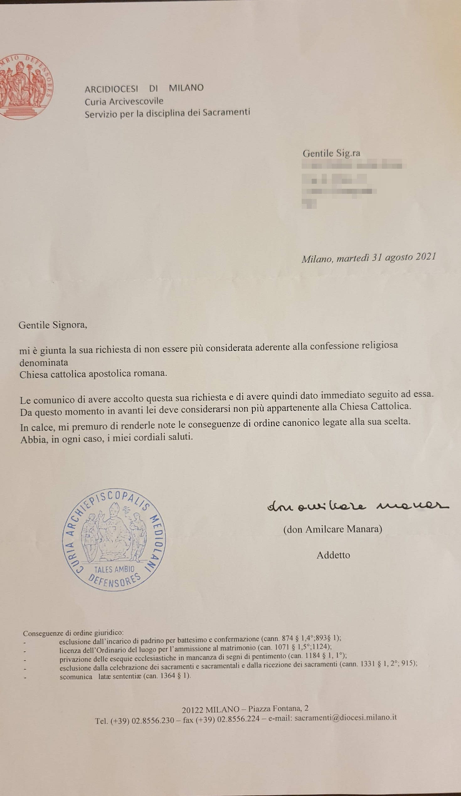 Una persona ha chiesto la rettifica dei dati relativi al proprio battesimo avvenuto a S. Giustina - MILANO (MI) il 31/08/2021, dichiarando di non voler più far parte della Chiesa Cattolica.