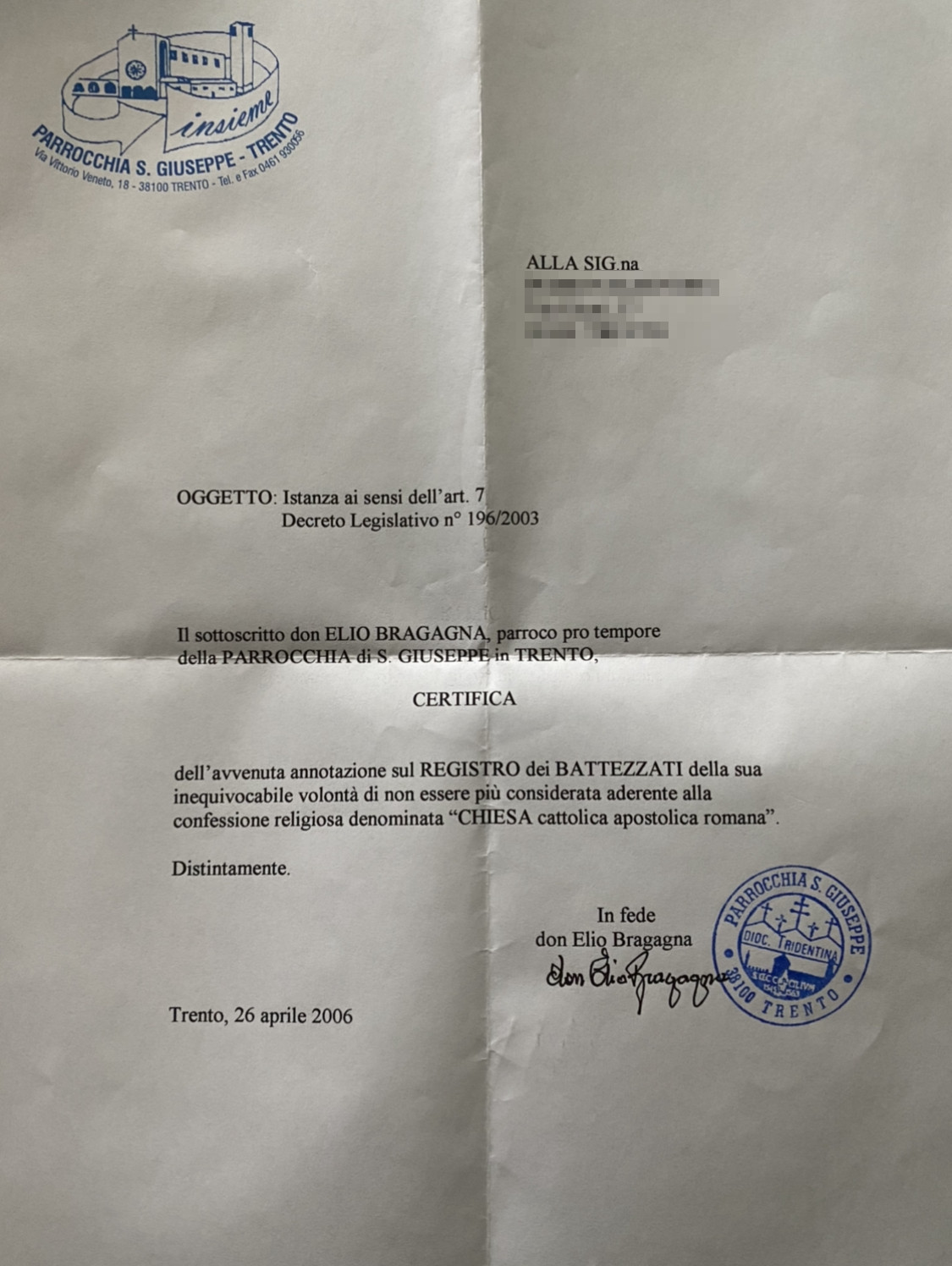 Una persona ha chiesto la rettifica dei dati relativi al proprio battesimo avvenuto a S. Giuseppe - TRENTO (TN) il 26/04/2006, dichiarando di non voler più far parte della Chiesa Cattolica.