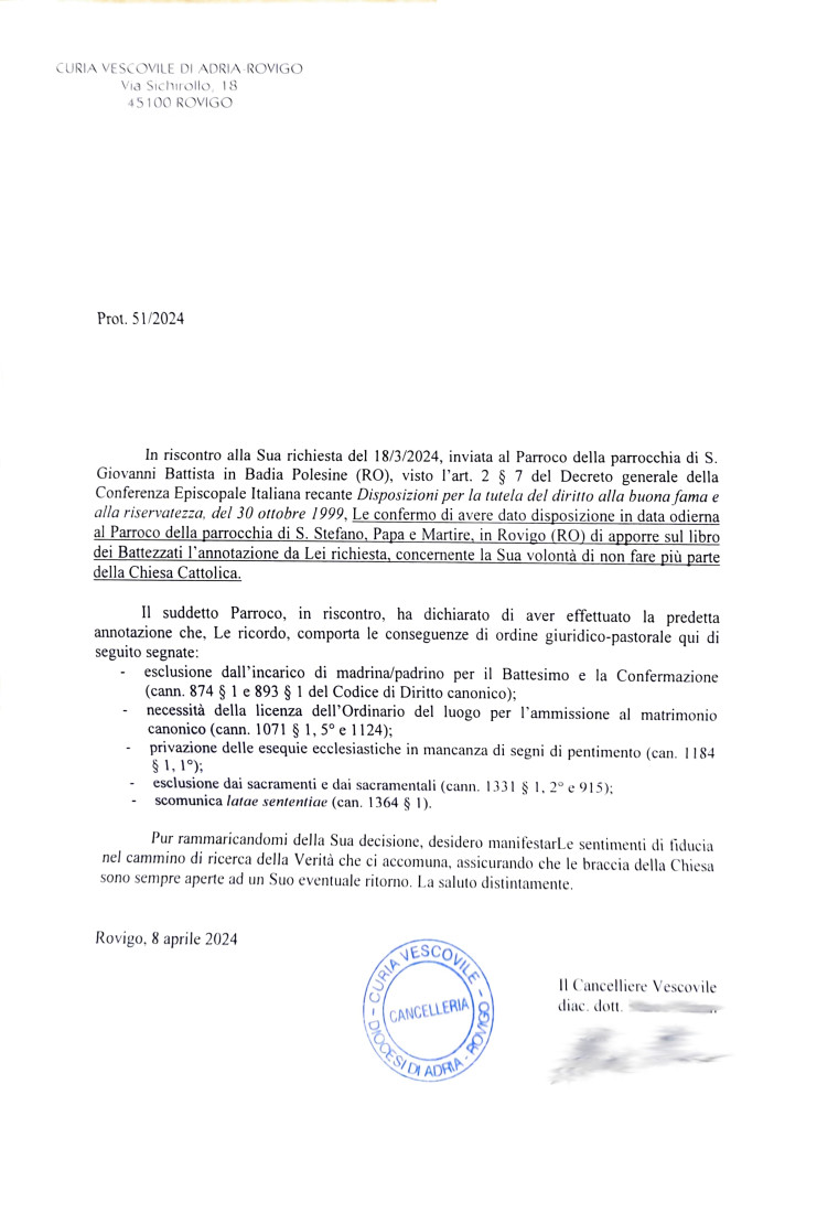 Una persona ha chiesto la rettifica dei dati relativi al proprio battesimo avvenuto a S. Giovanni Battista - BADIA POLESINE (RO) il 08/04/2024, dichiarando di non voler più far parte della Chiesa Cattolica.