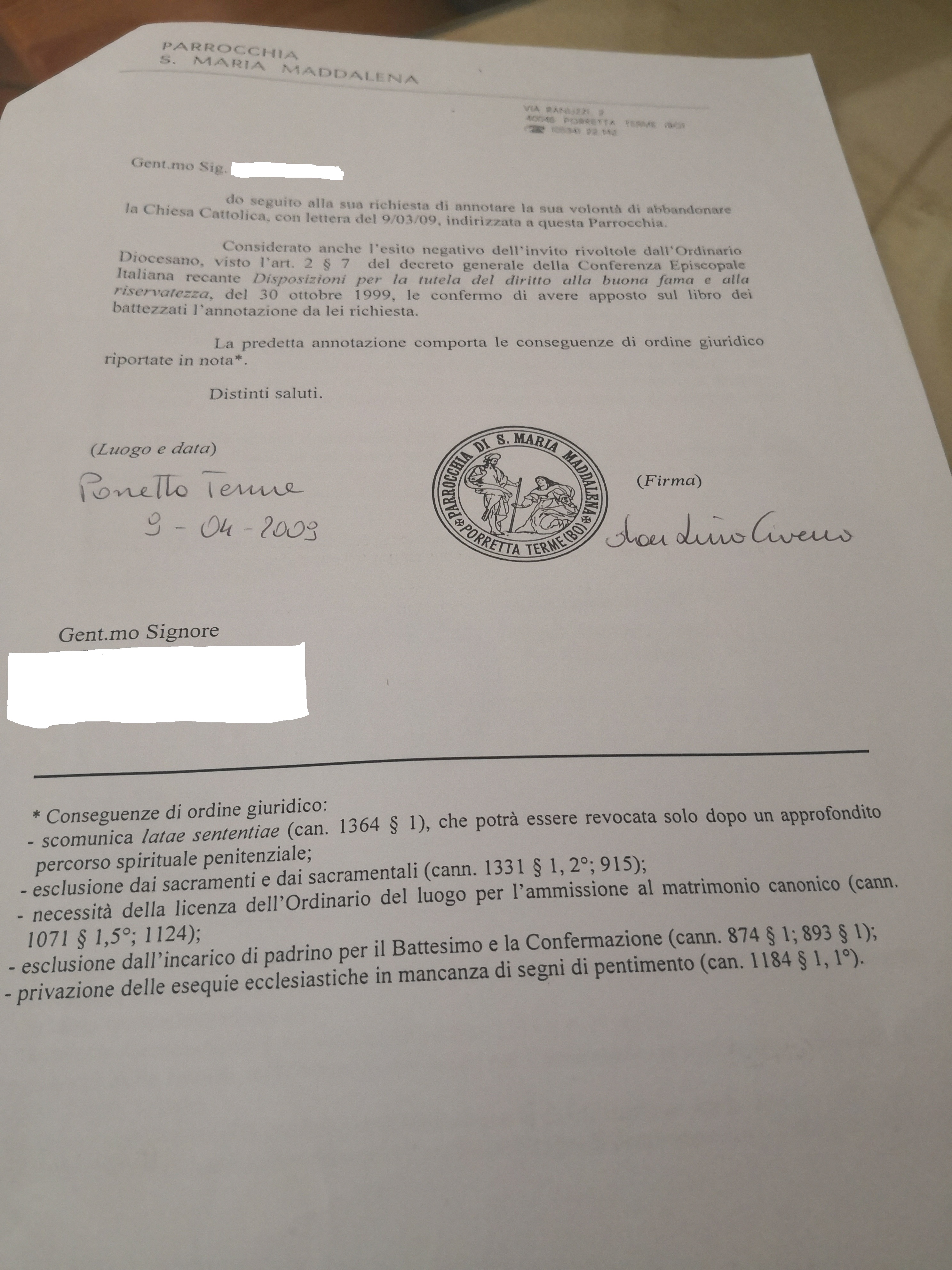 Una persona ha chiesto la rettifica dei dati relativi al proprio battesimo avvenuto a S. Maria Maddalena di Porretta Terme - ALTO RENO TERME (BO) il 09/04/2009, dichiarando di non voler più far parte della Chiesa Cattolica.