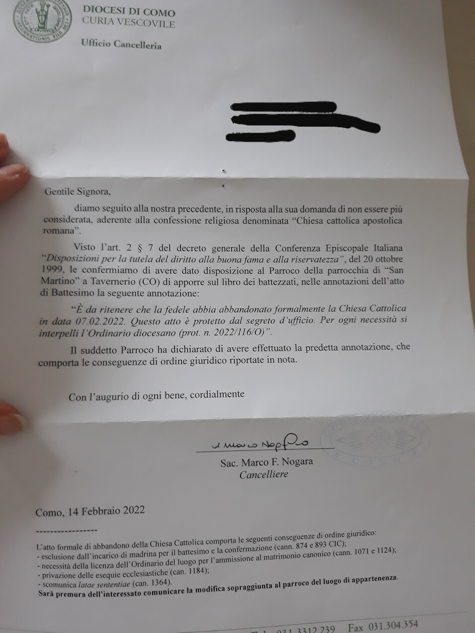 Una persona ha chiesto la rettifica dei dati relativi al proprio battesimo avvenuto a S. Giovanni Battista - TAVERNERIO (CO) il 14/02/2022, dichiarando di non voler più far parte della Chiesa Cattolica.