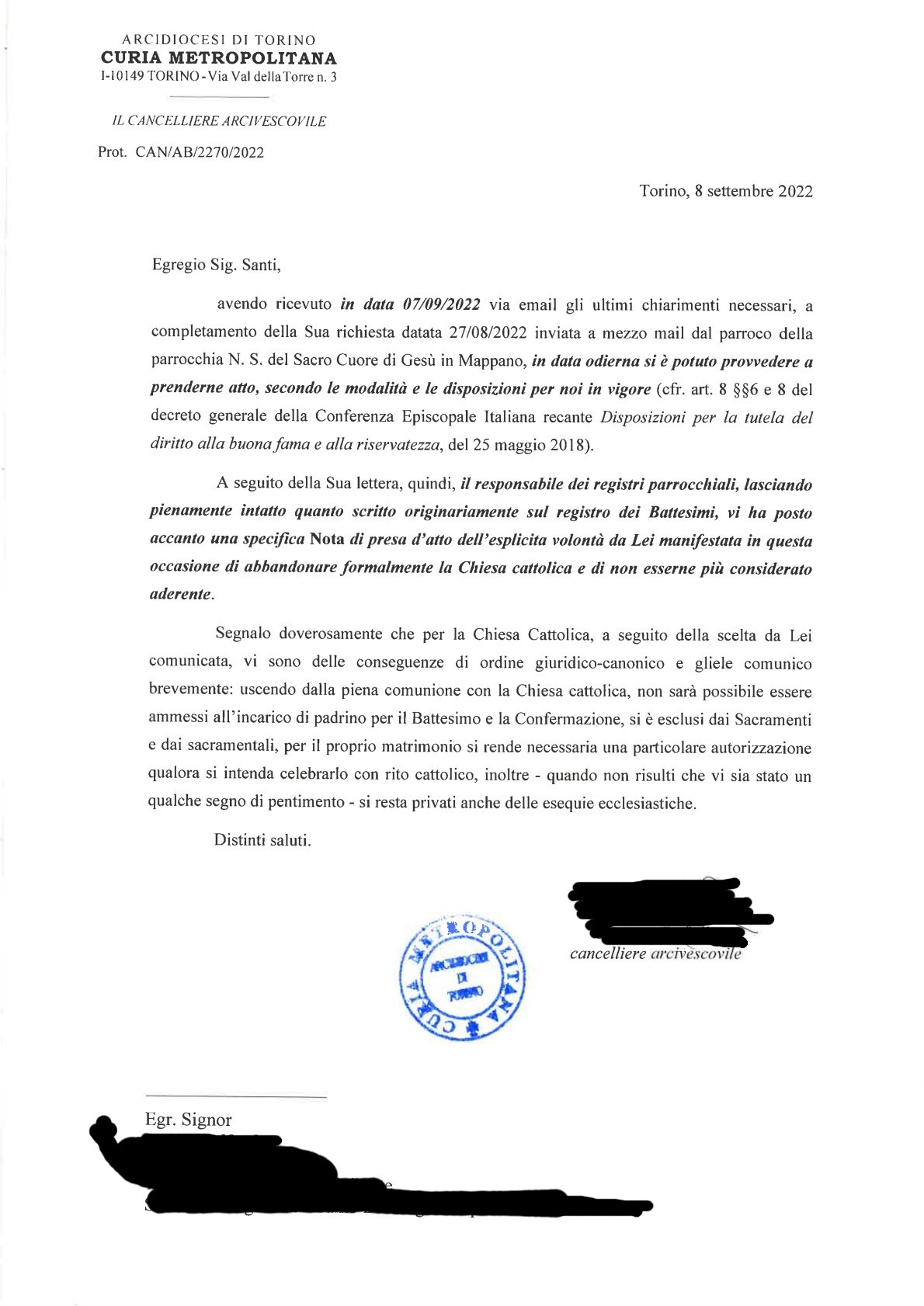 Una persona ha chiesto la rettifica dei dati relativi al proprio battesimo avvenuto a Nostra Signora del Sacro Cuore di Gesù - MAPPANO (TO) il 07/09/2022, dichiarando di non voler più far parte della Chiesa Cattolica.