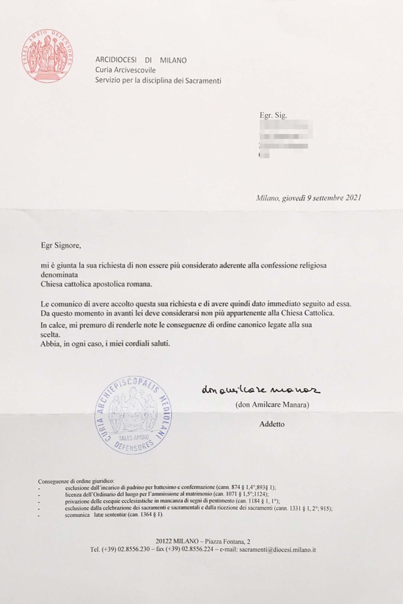 Una persona ha chiesto la rettifica dei dati relativi al proprio battesimo avvenuto a S. Maria Assunta in Turro - MILANO (MI) il 09/09/2021, dichiarando di non voler più far parte della Chiesa Cattolica.
