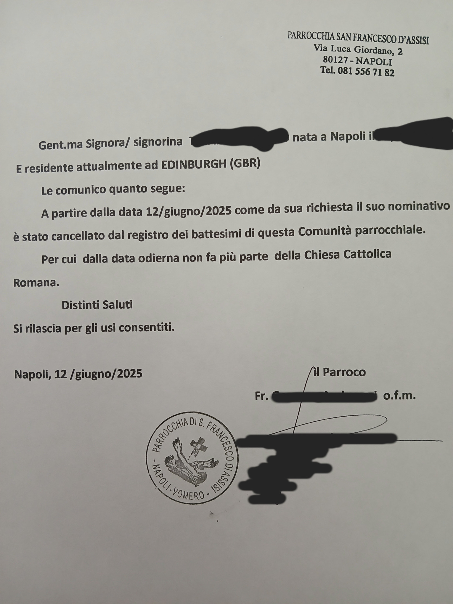 Una persona ha chiesto la rettifica dei dati relativi al proprio battesimo avvenuto a S. Francesco d'Assisi - NAPOLI (NA) il 13/06/2025, dichiarando di non voler più far parte della Chiesa Cattolica.