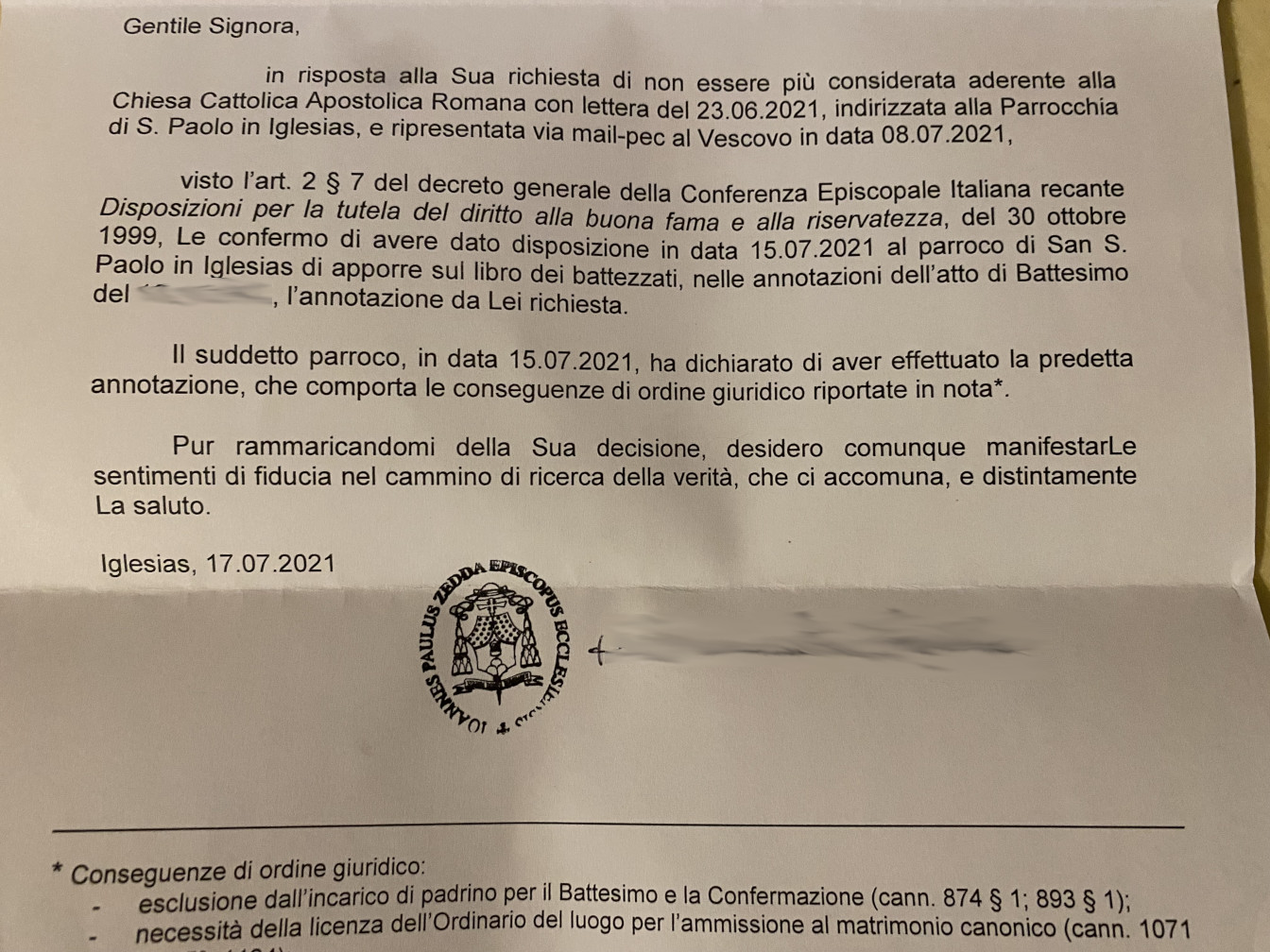 Una persona ha chiesto la rettifica dei dati relativi al proprio battesimo avvenuto a S. Paolo Apostolo - IGLESIAS (SU) il 15/07/2021, dichiarando di non voler più far parte della Chiesa Cattolica.