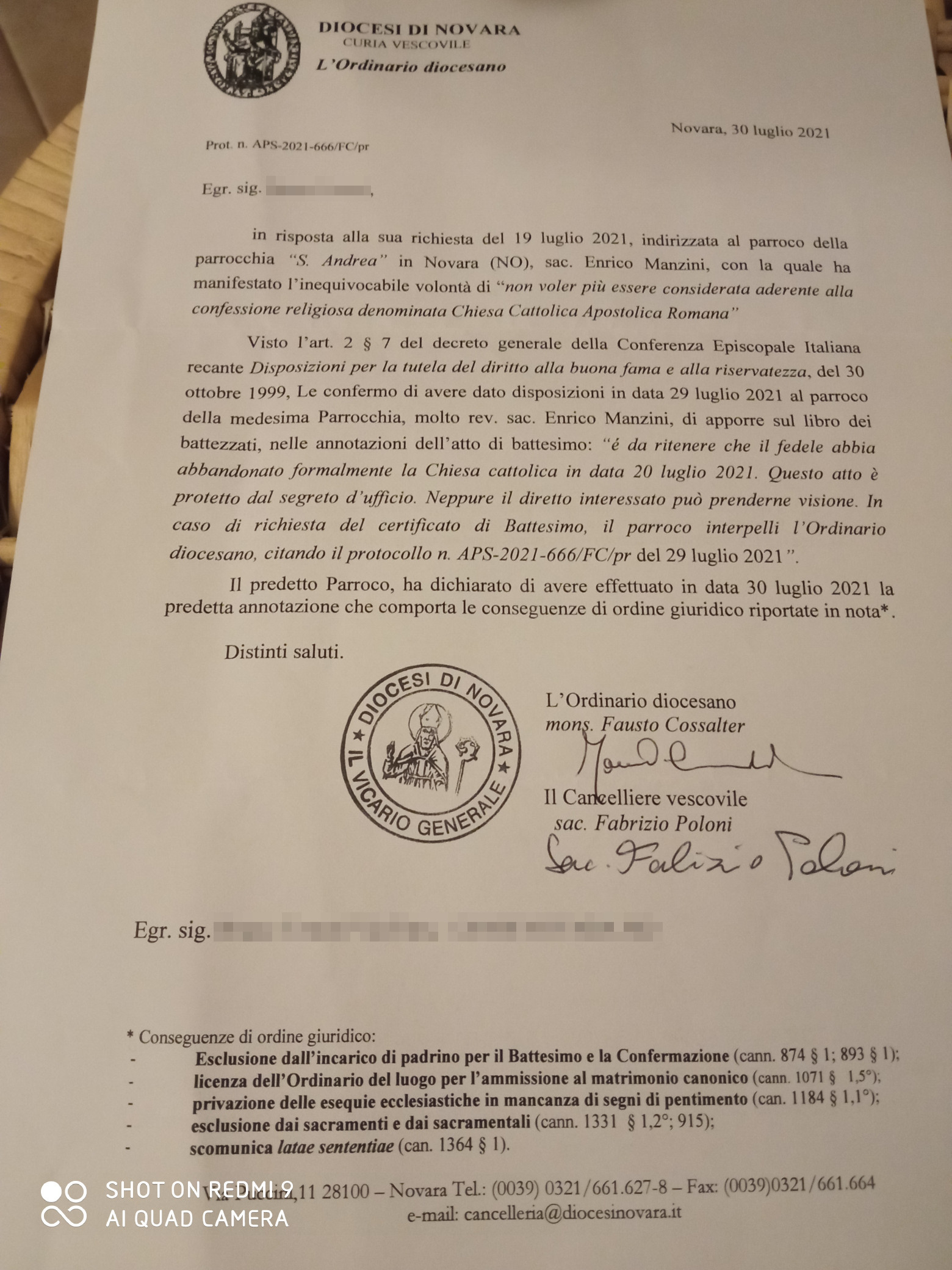 Una persona ha chiesto la rettifica dei dati relativi al proprio battesimo avvenuto a Sant'Andrea - NOVARA (NO) il 30/07/2021, dichiarando di non voler più far parte della Chiesa Cattolica.