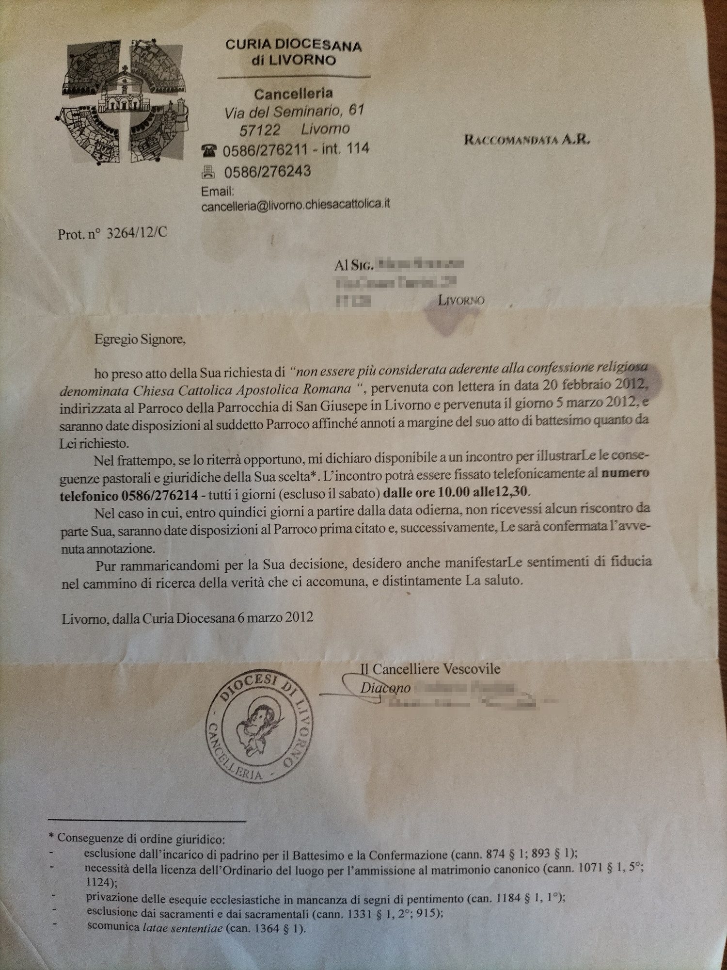 Una persona ha chiesto la rettifica dei dati relativi al proprio battesimo avvenuto a S. Giuseppe - LIVORNO (LI) il 06/03/2012, dichiarando di non voler più far parte della Chiesa Cattolica.