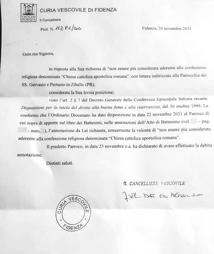 Una persona ha chiesto la rettifica dei dati relativi al proprio battesimo avvenuto a Santi Gervasio e Protasio - POLESINE ZIBELLO (PR) il 23/11/2021, dichiarando di non voler più far parte della Chiesa Cattolica.