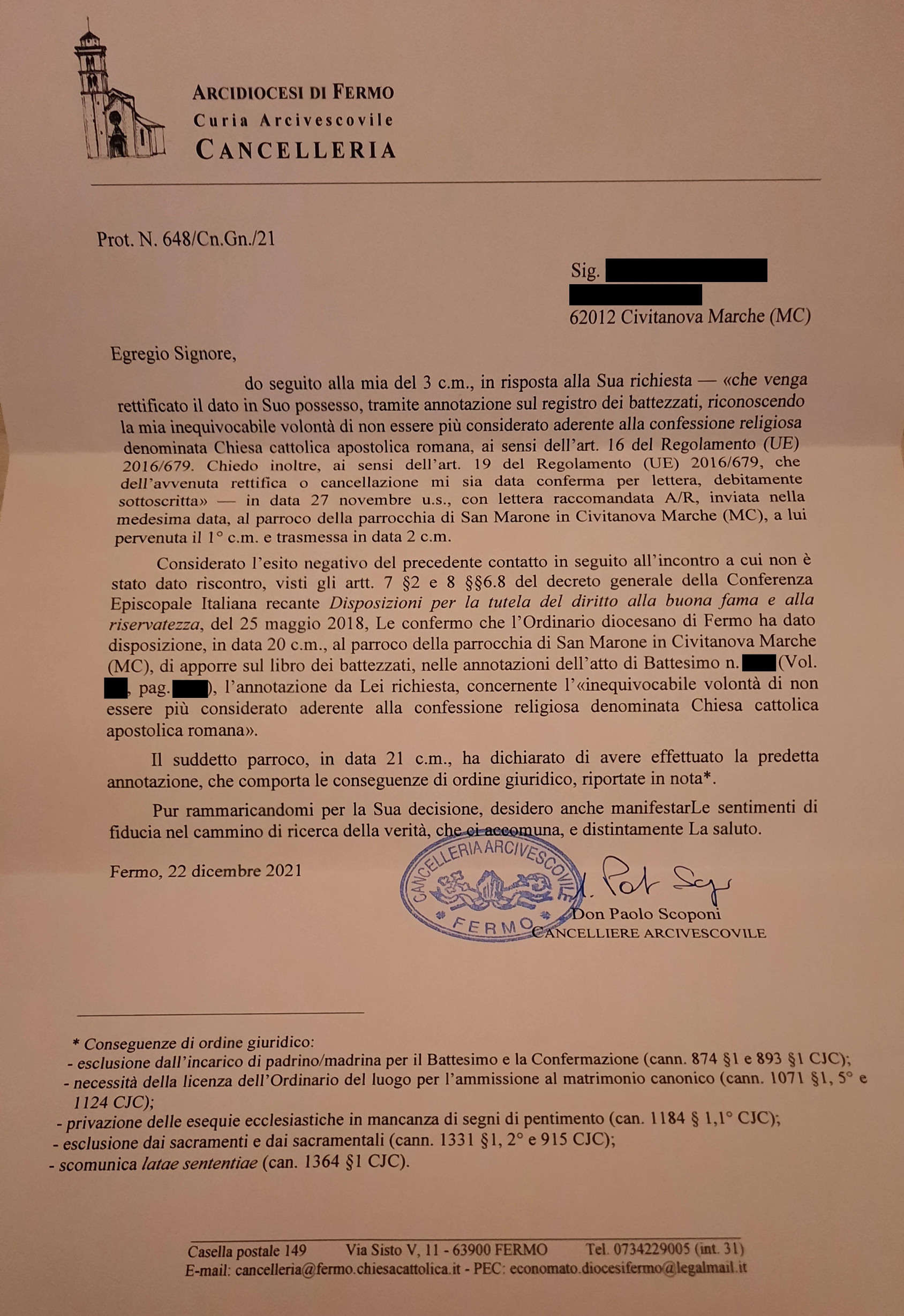 Una persona ha chiesto la rettifica dei dati relativi al proprio battesimo avvenuto a S. Marone - CIVITANOVA MARCHE (MC) il 22/12/2021, dichiarando di non voler più far parte della Chiesa Cattolica.
