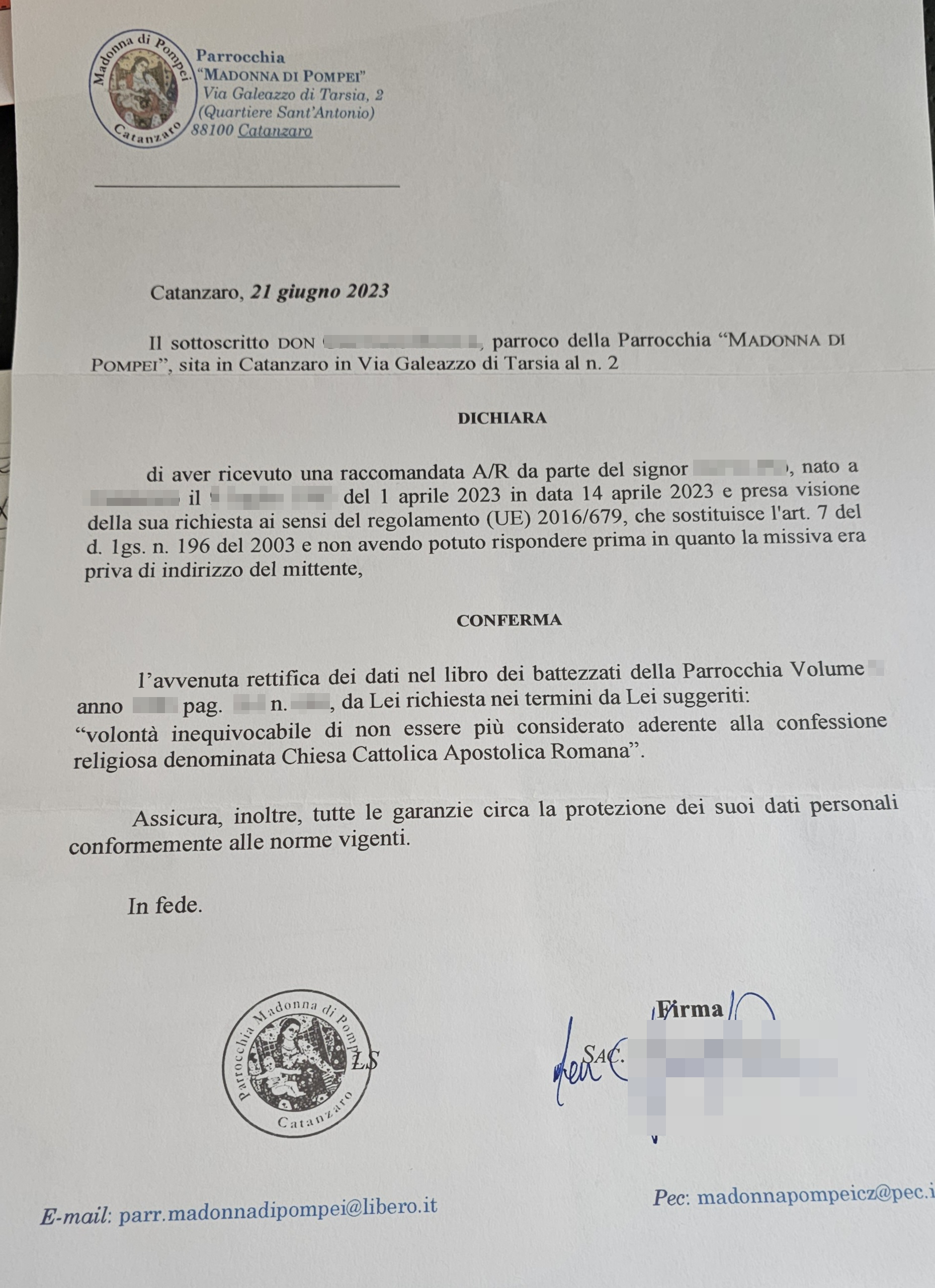 Una persona ha chiesto la rettifica dei dati relativi al proprio battesimo avvenuto a Madonna di Pompei - CATANZARO (CZ) il 21/06/2023, dichiarando di non voler più far parte della Chiesa Cattolica.