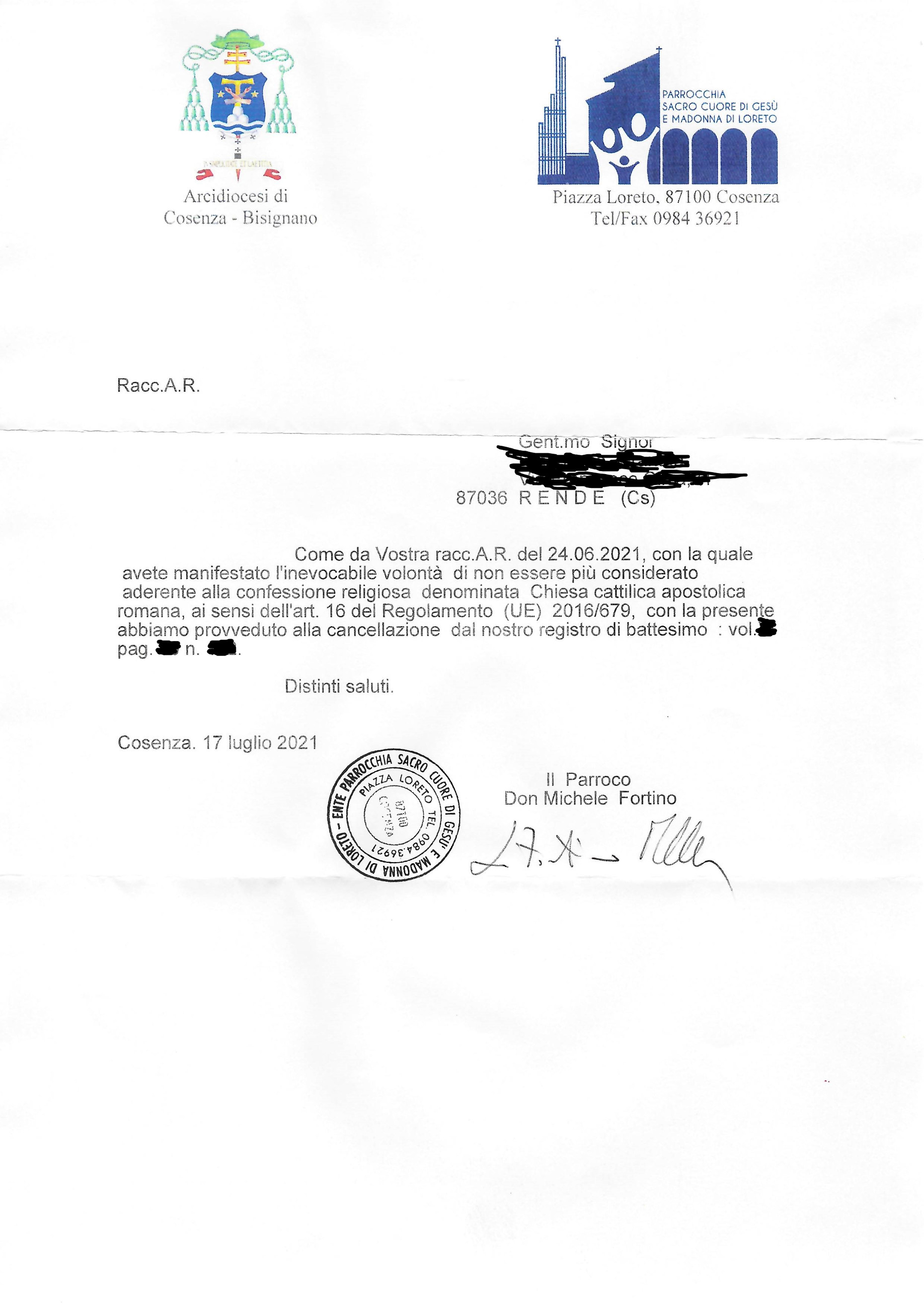 Una persona ha chiesto la rettifica dei dati relativi al proprio battesimo avvenuto a Sacro Cuore di Gesù - COSENZA (CS) il 17/07/2021, dichiarando di non voler più far parte della Chiesa Cattolica.