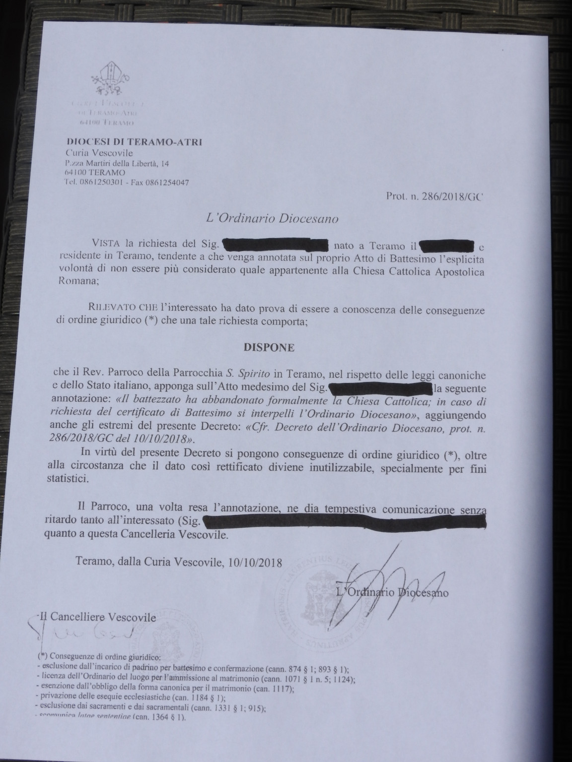 Una persona ha chiesto la rettifica dei dati relativi al proprio battesimo avvenuto a S. Spirito - TERAMO (TE) il 10/10/2018, dichiarando di non voler più far parte della Chiesa Cattolica.